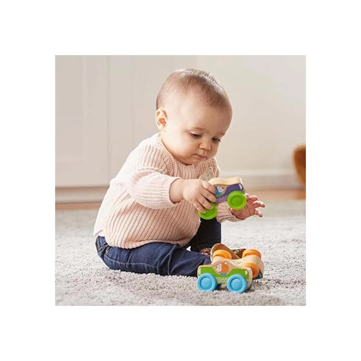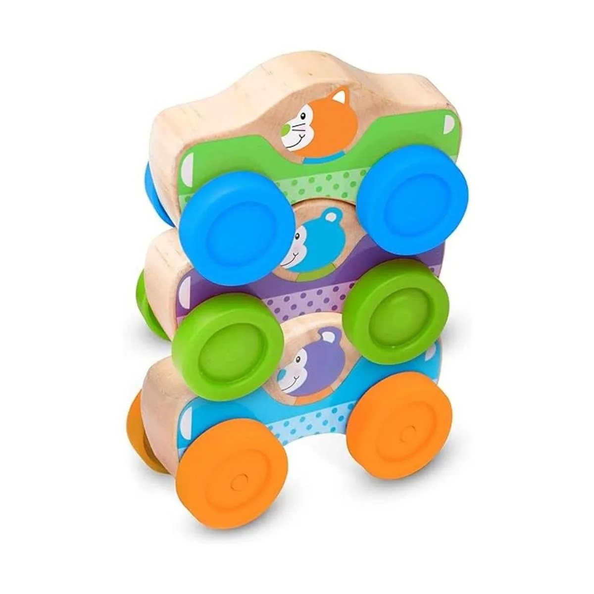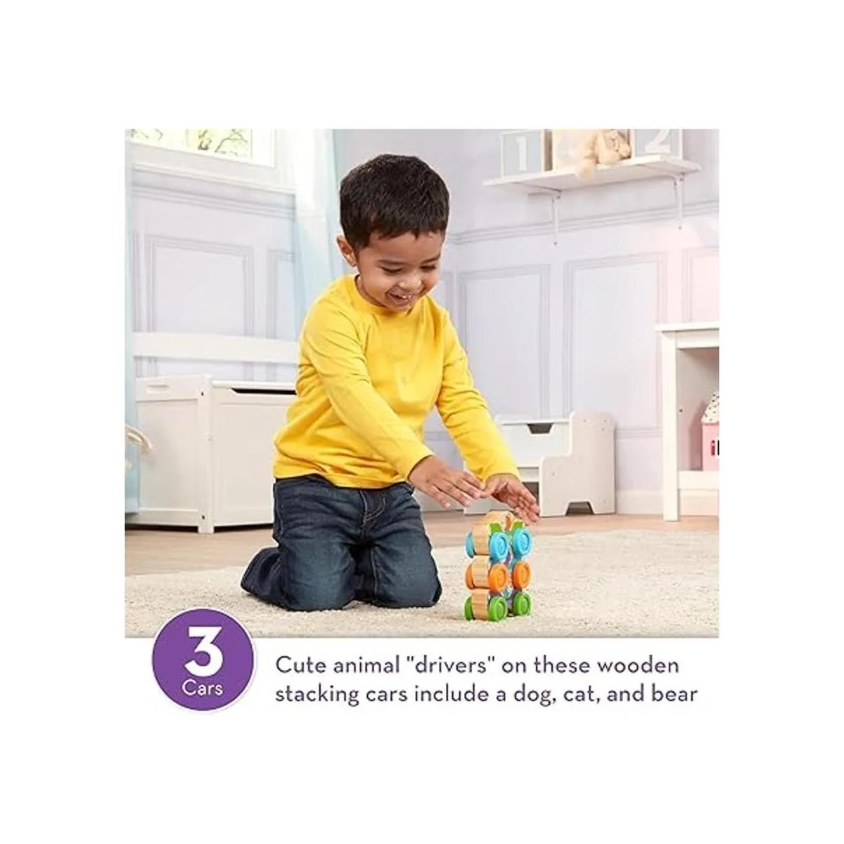 Diversión de coche de carreras: apila, enrolla y corre estos tres coches de madera con conductores de animales amigables