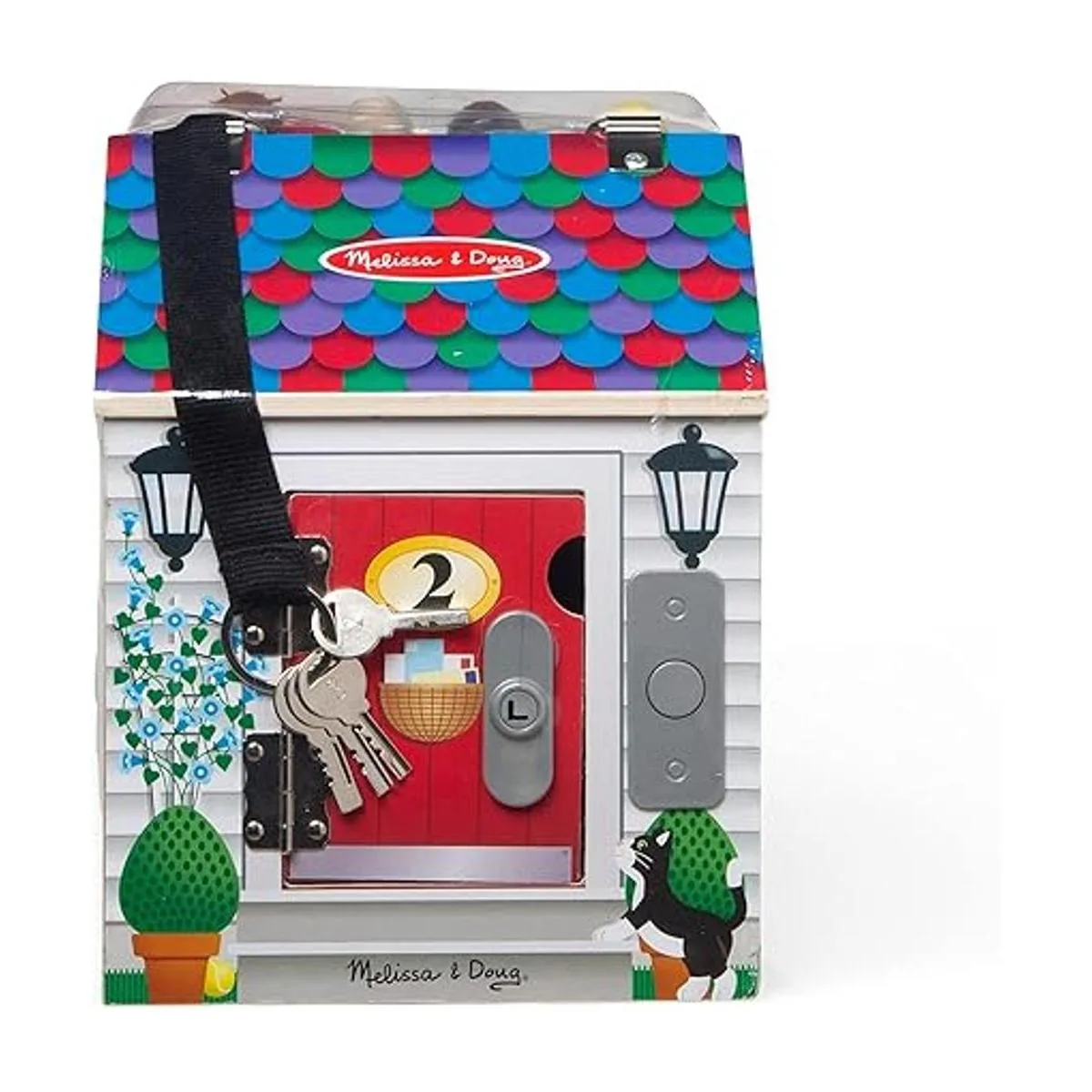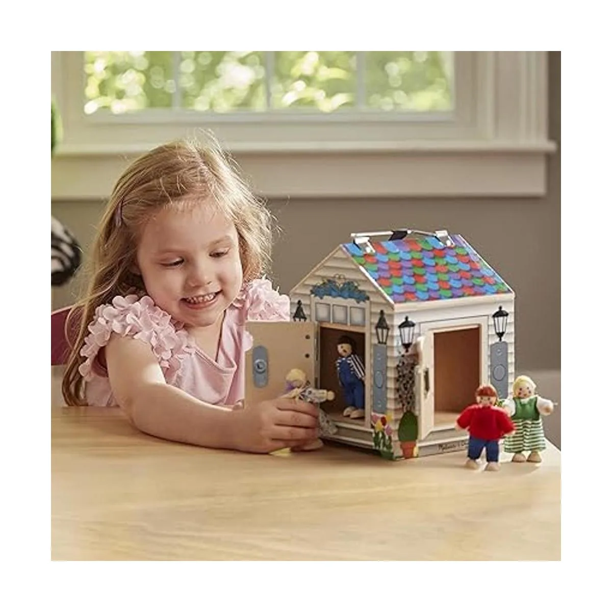 Melissa Doug Casa de muñecas de madera con campanilla, para llevar, con sonidos de campanillas, llaves, 4 muñecas de madera que posan