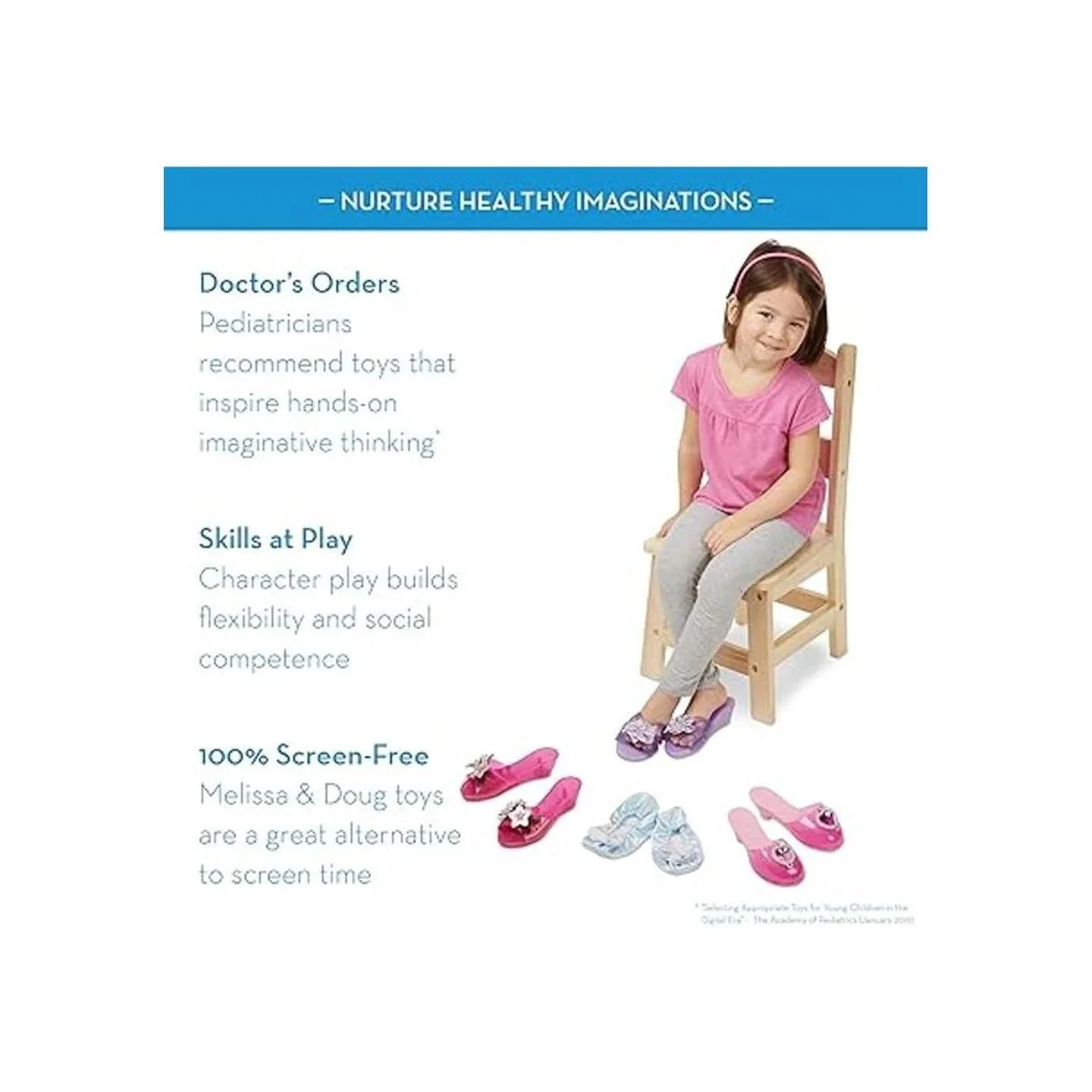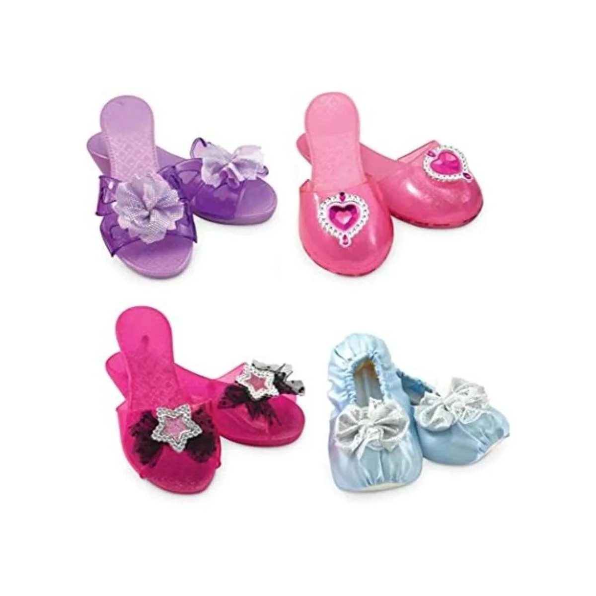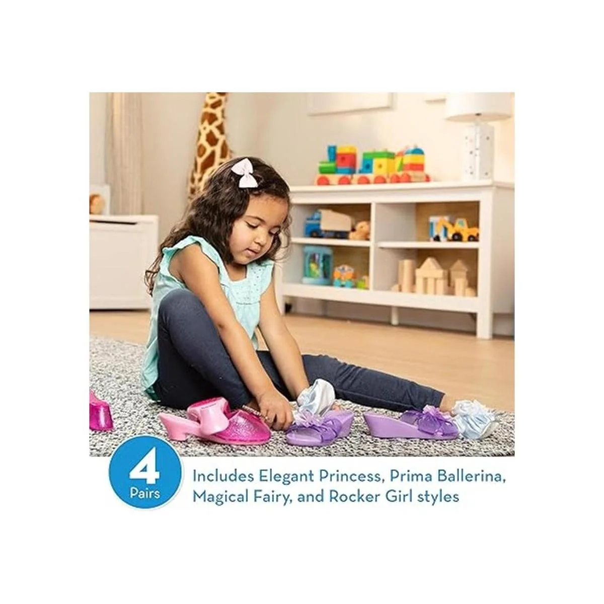 4 pares de zapatos de vestir: la colección Melissa Doug Role Play entra con estilo Los zapatos de vestir incluyen cuatro estilos; princesa elegante, bailarina Prima, hada mágica y chica rockera.