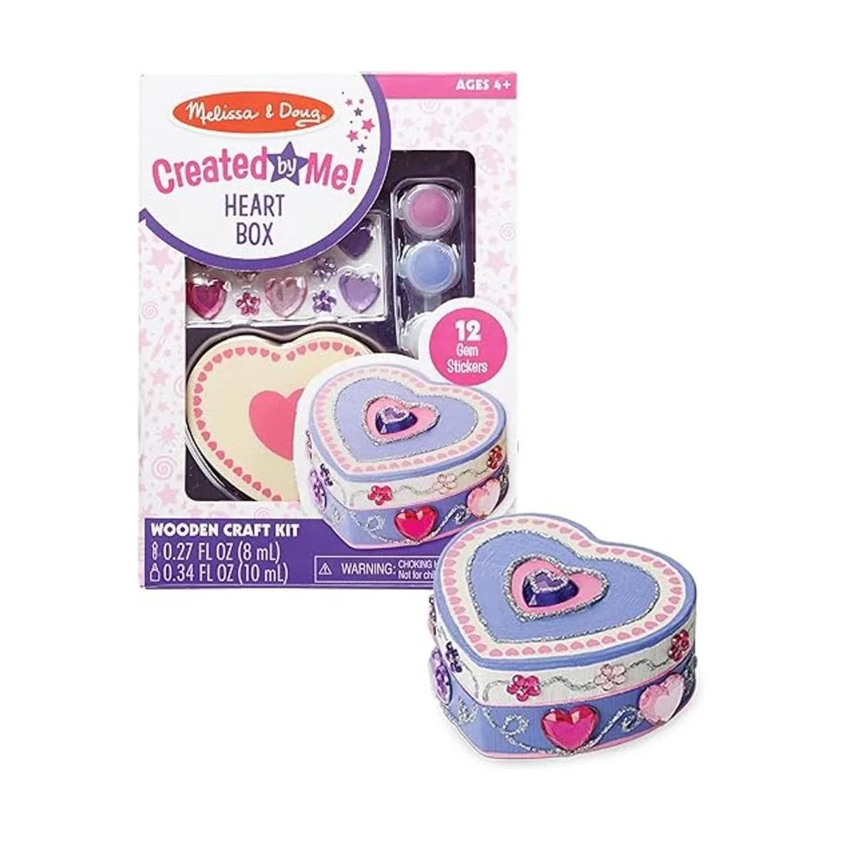 Incluye caja de madera con forma de corazón, 12 calcomanías de gemas, 4 botes de pintura, pincel, pegamento con purpurina y pegamento blanco.