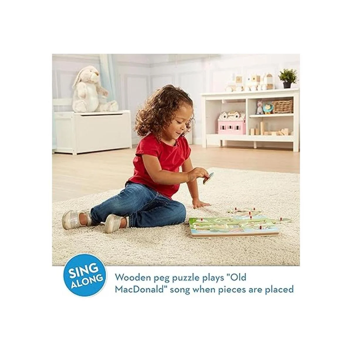 Canta y aprende: el viejo MacDonald comienza la canción y los animales completan sus versículos por ejemplo, el cerdo canta, Y en esa granja tenía un cerdo, EIIO . . . etc.. Las instrucciones y letras están incluidas en el rompecabezas para que los niños puedan cantar Este rompecabezas ayuda a enseñar la coordinación ojomano y la resolución de problemas y ayuda a desarrollar habilidades de procesamiento auditivo.