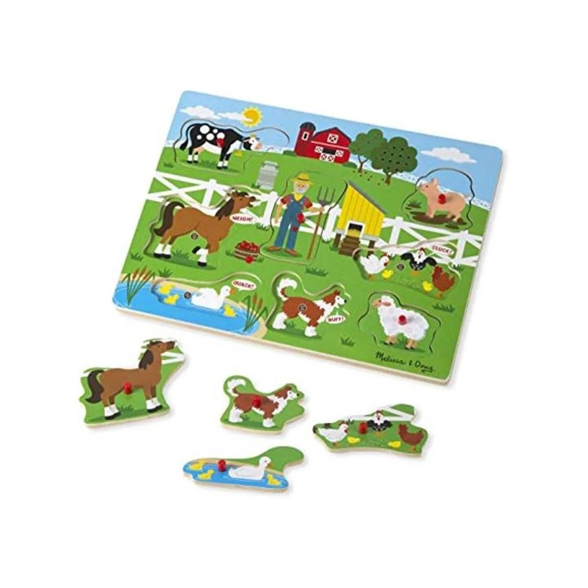 Rompecabezas de clavijas fácil de agarrar con sonidos: el rompecabezas Melissa Doug Old MacDonald reproduce Old MacDonald cuando se colocan las piezas. Las clavijas ayudan a los niños de dos años en adelante a agarrar y manipular fácilmente las ocho piezas encantadoramente ilustradas.