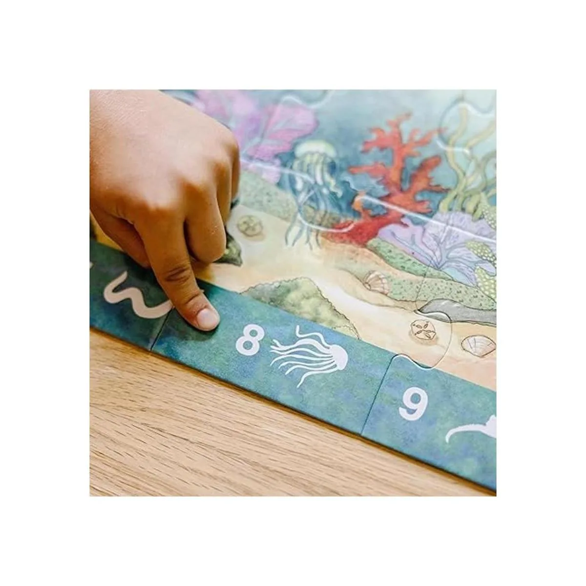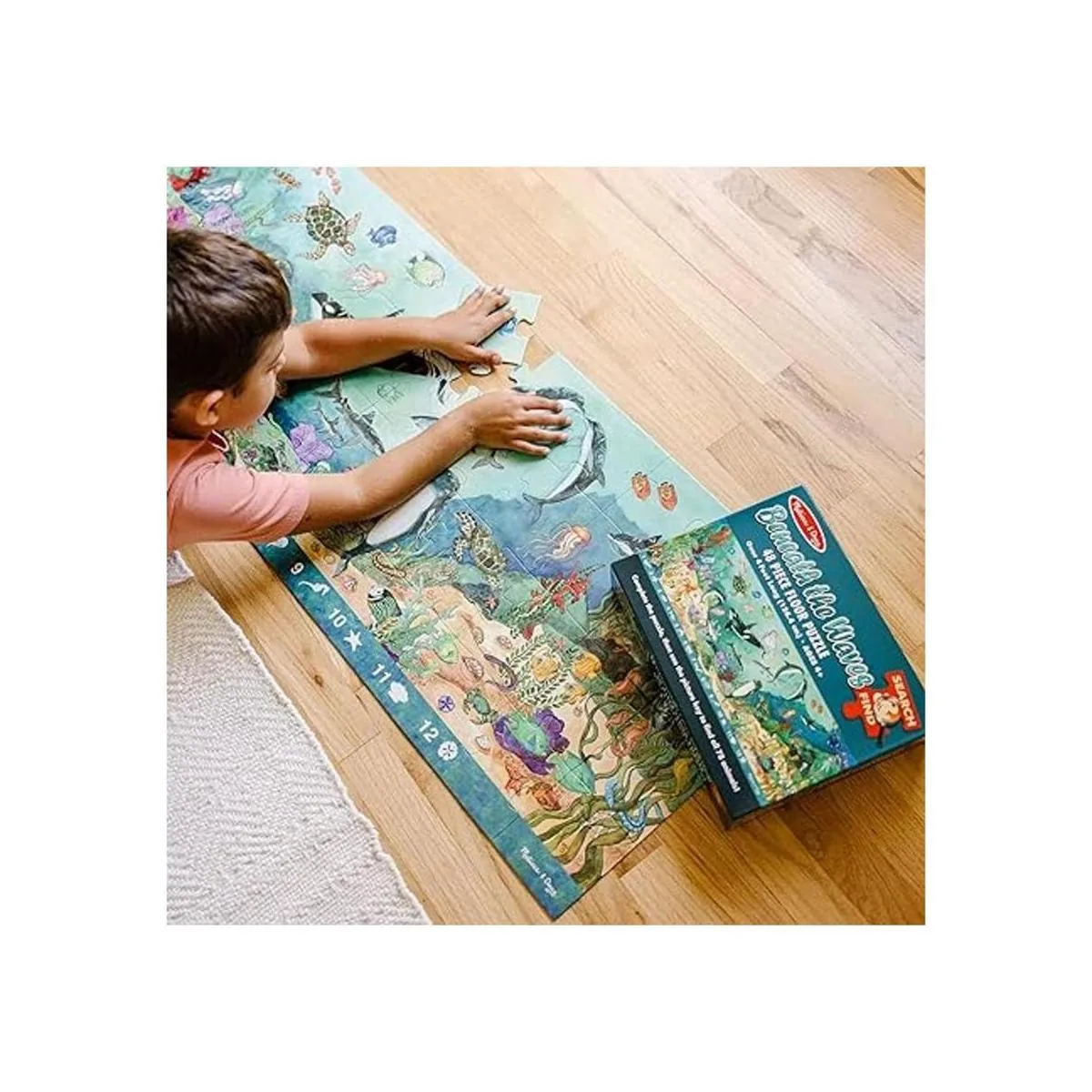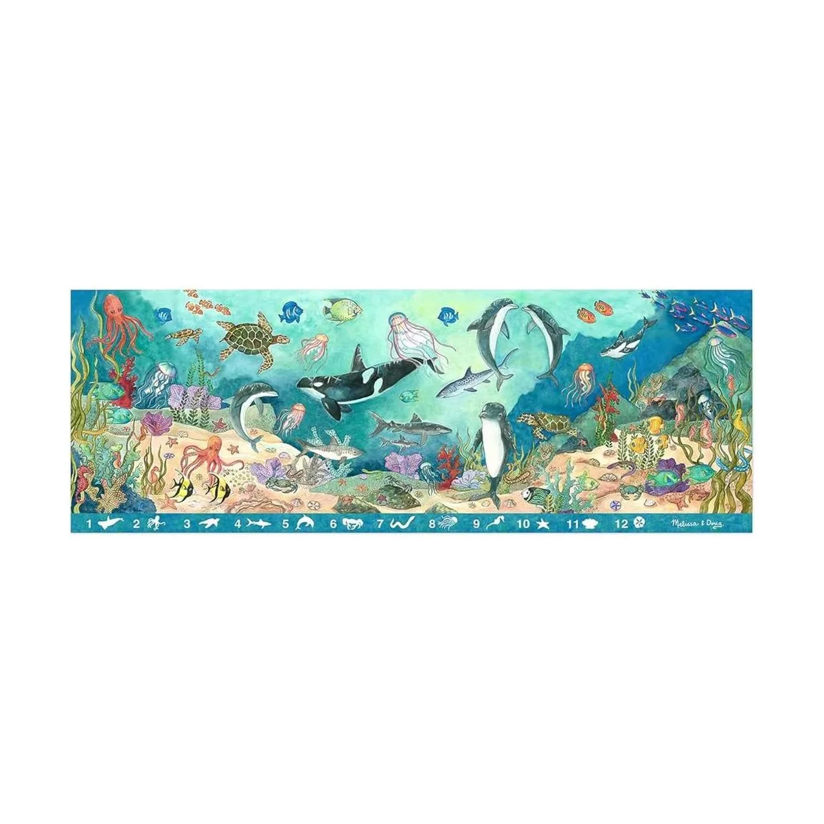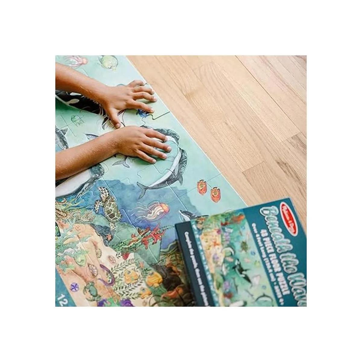 Rompecabezas de suelo con temática oceánica: el rompecabezas Melissa Doug Search Find Under the Sea Floor incluye 48 piezas que muestran una hermosa escena de vida oceánica. Mide 4 pies de largo cuando está montado.