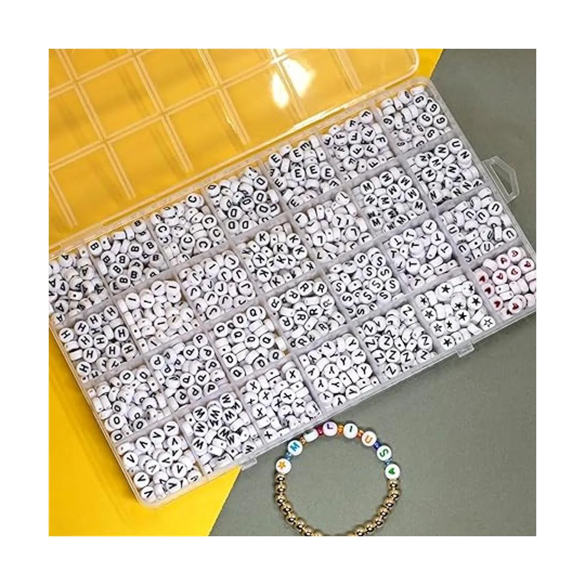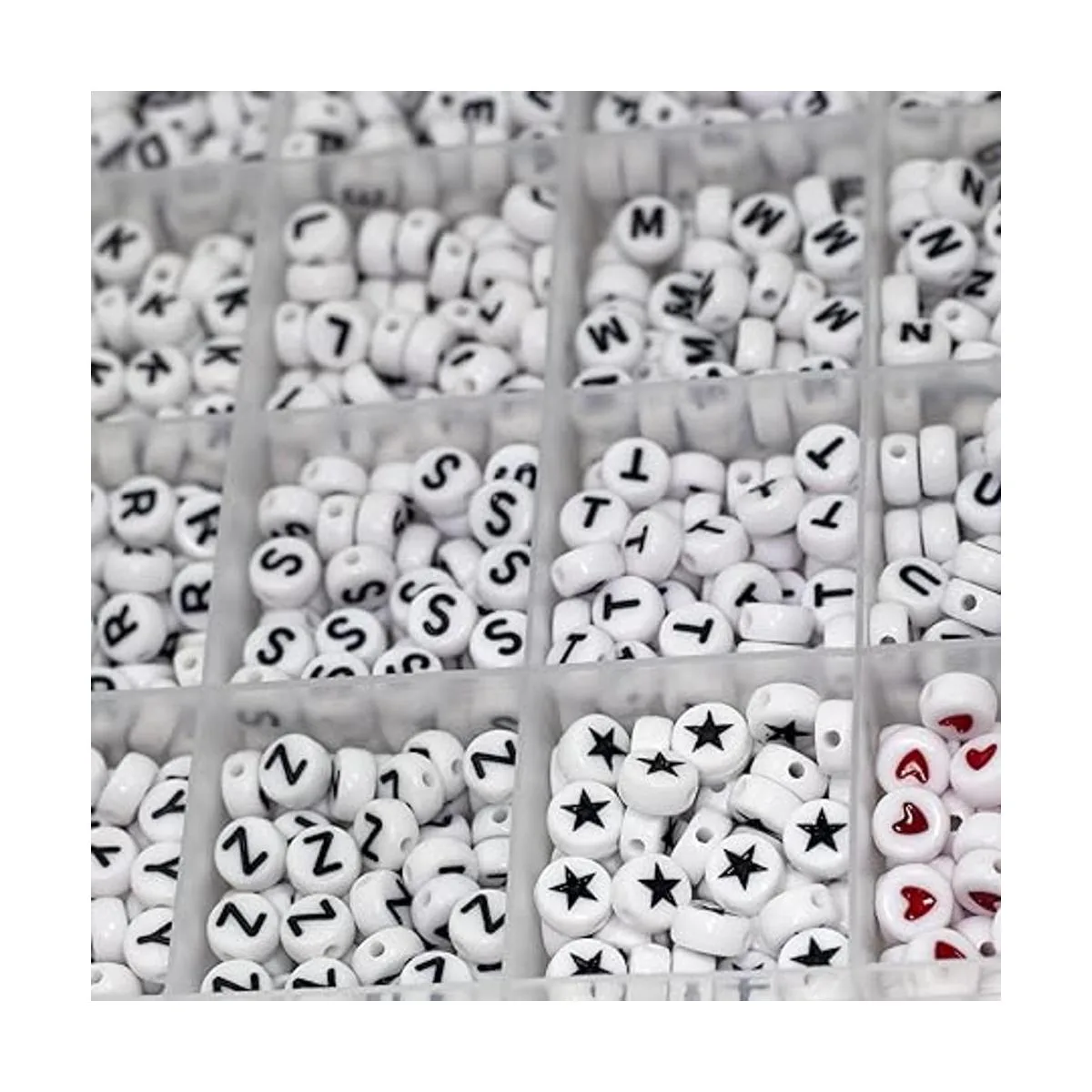 En pedido: la caja está separada en 28 compartimentos e incluye las 26 letras, cuentas de corazón y estrella, 50 piezas para cada tipo de cuentas, y 10 cuentas adicionales para cada vocal. El color de las cuentas es blanco, las letras, las estrellas son negras; los patrones de corazón son rojos. 26 letras están preclasificadas y en estricto orden para que no tengas que preocuparte por cantidades inexactas.