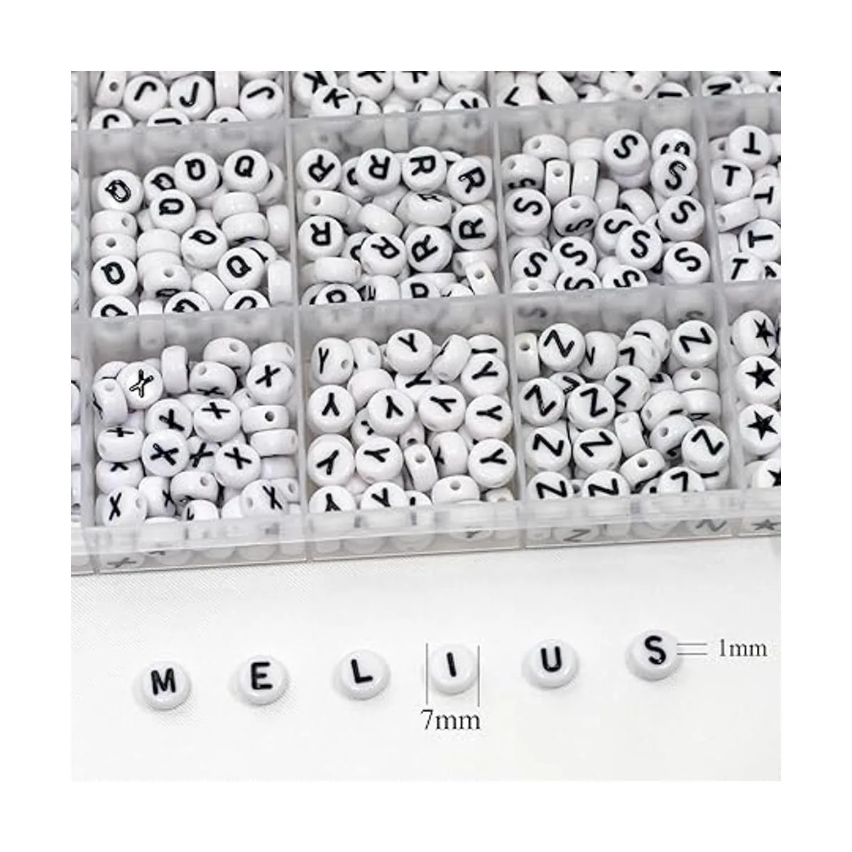 Recibirás: una caja de 28 rejillas con 26 letras, cuentas de corazón y cuentas de estrella, 50 piezas para cada tipo de cuentas y 10 cuentas adicionales para cada vocal. El juego tiene un total de 1450 cuentas redondas de acrílico blanco de 4 x 7.