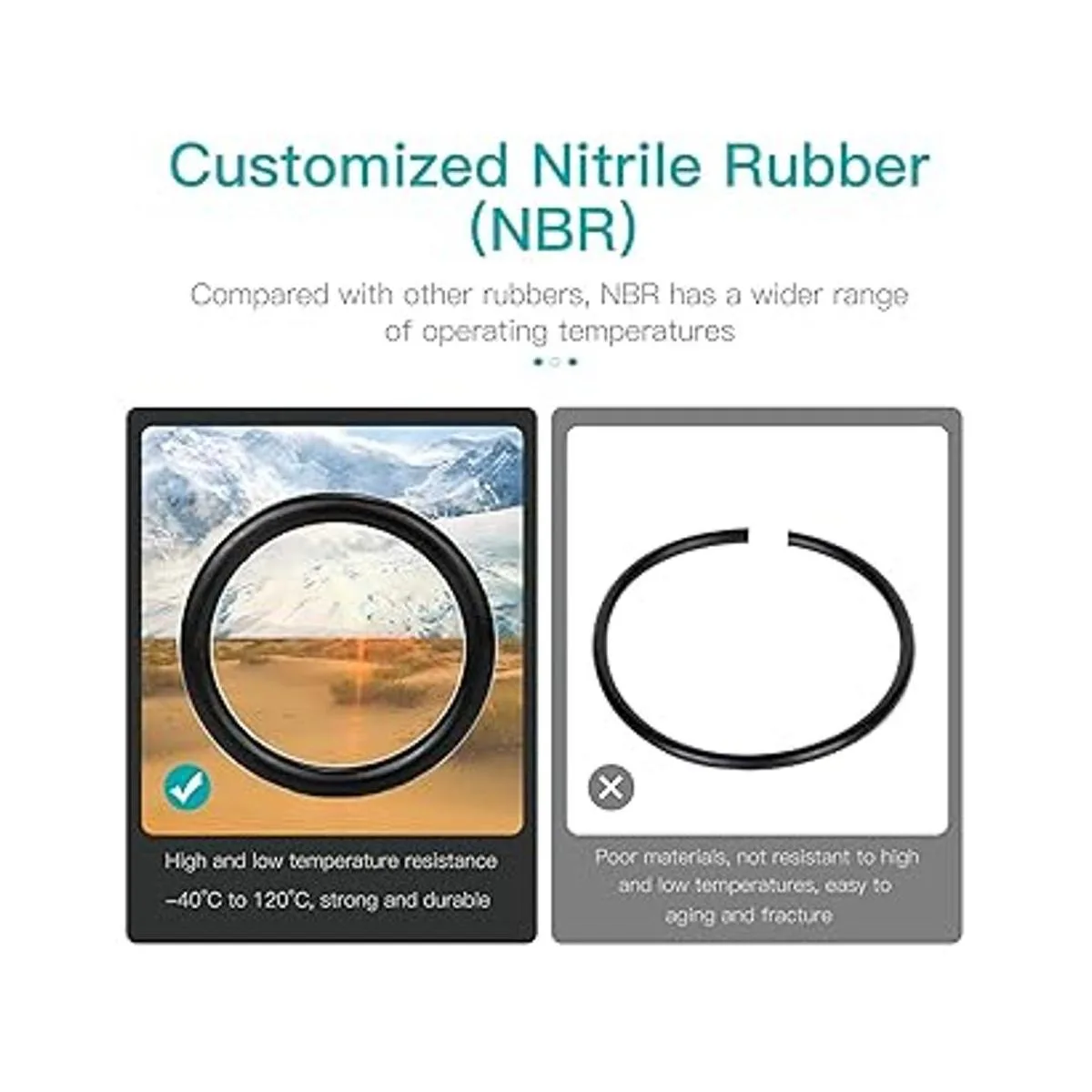 Caucho personalizado: el caucho de nitrilo personalizado NBR se utiliza para despedirse de la goma ordinaria que se rompe cuando se utiliza y se derrite cuando se expone al sol. Las juntas tóricas que utilizamos tienen una fuerte resistencia al desgaste y una excelente resistencia al calor. En comparación con otras gomas, NBR tiene una gama más amplia de temperaturas de funcionamiento. Debido a que el anillo de goma es siempre un consumible, proporcionamos 20 anillos de fijación, solo para facilitar tu uso diario.