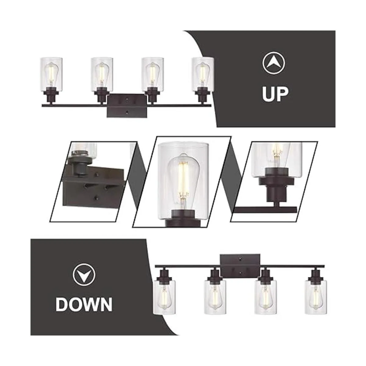 Diseño único: estos elegantes apliques de 4 luces cuentan con un soporte de pared cuadrado de metal y la pantalla cilíndrica de vidrio transparente que difunde suavemente la luz cuando el accesorio está iluminado, añade un toque elegante a tu hogar. El diseño de iluminación de pared permite instalar este aplique en una posición hacia arriba o hacia abajo.
