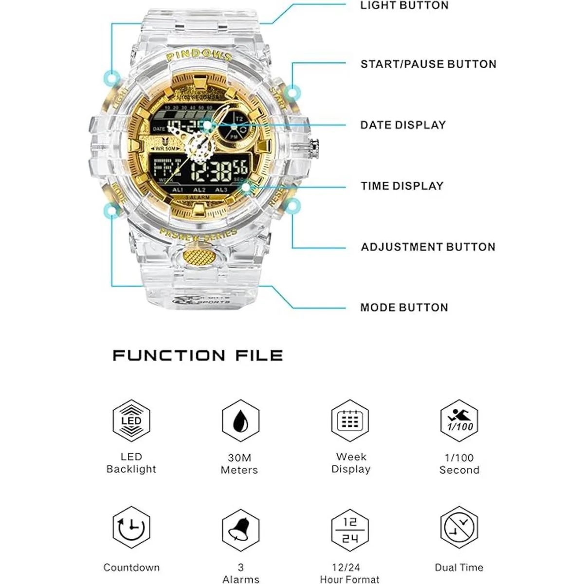 Multifunción : 3 grupos de alarmas, resistente al agua hasta 164.0 ft, luz nocturna de un color, doble tiempo, cuenta atrás, cronómetro, visualización de calendario semanal, formato de 12/24 horas. Nota: no presiones ningún botón en el agua, y no lo uses cuando te duches caliente para evitar que entre niebla de agua.