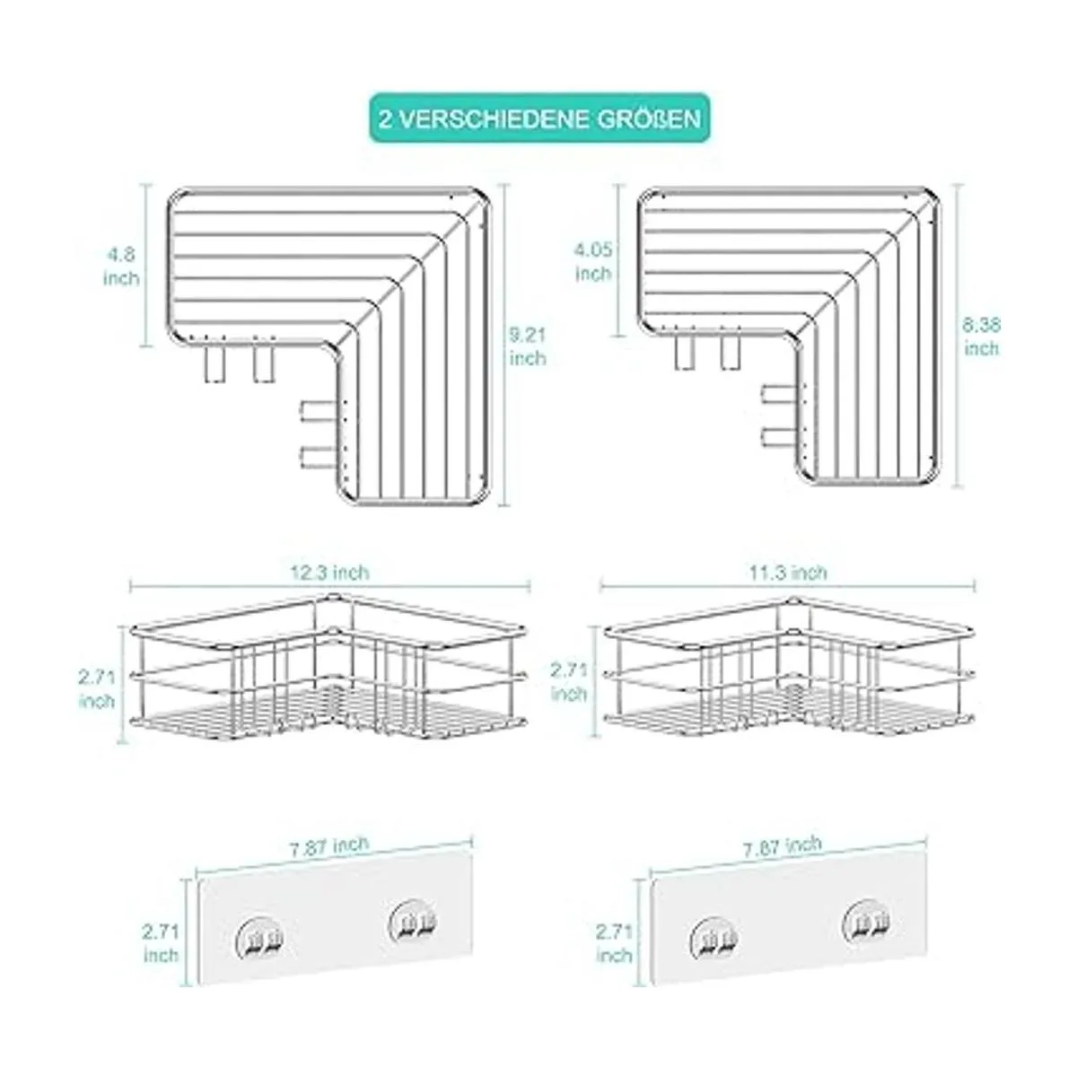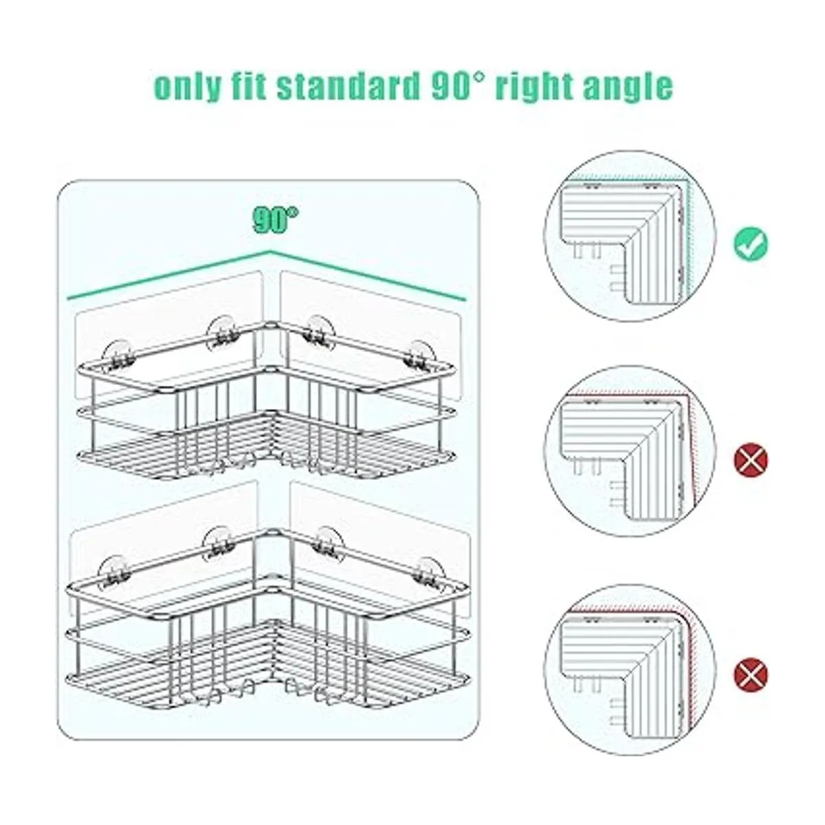 Gran capacidad: estos estantes de ducha se adaptan a esquinas de ángulo recto de 90. Mantén tu baño e inodoro limpios y limpios de todos esos jabones, champús y artículos de tocador que se atascan a tu camino. Cada estante de ducha con 2 ganchos puede contener la maquinilla de afeitar, toalla, esponja, cepillo y mucho más.
