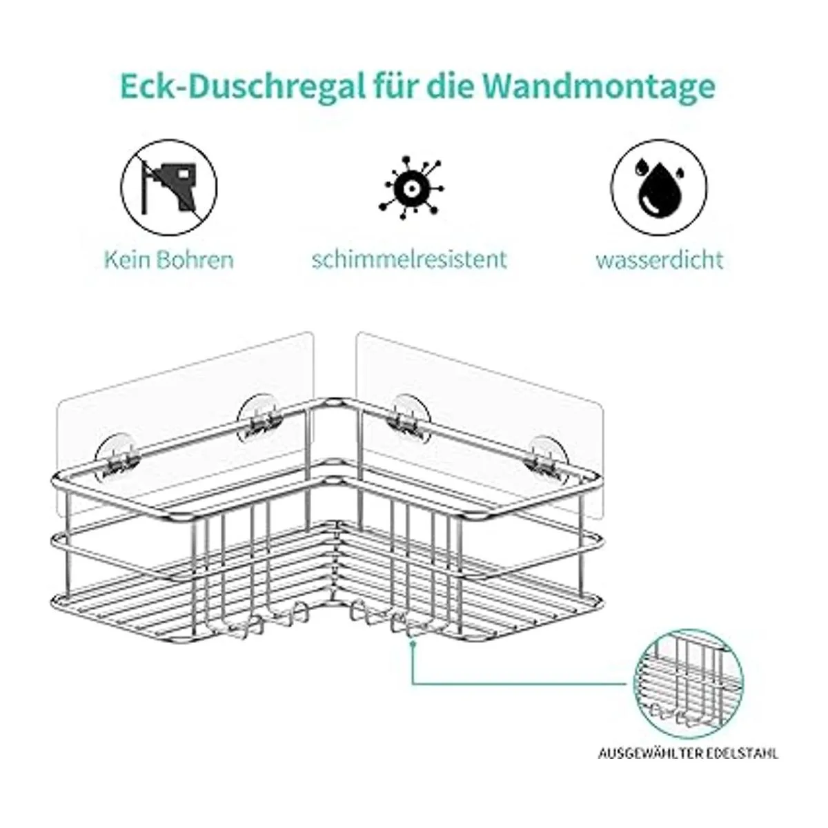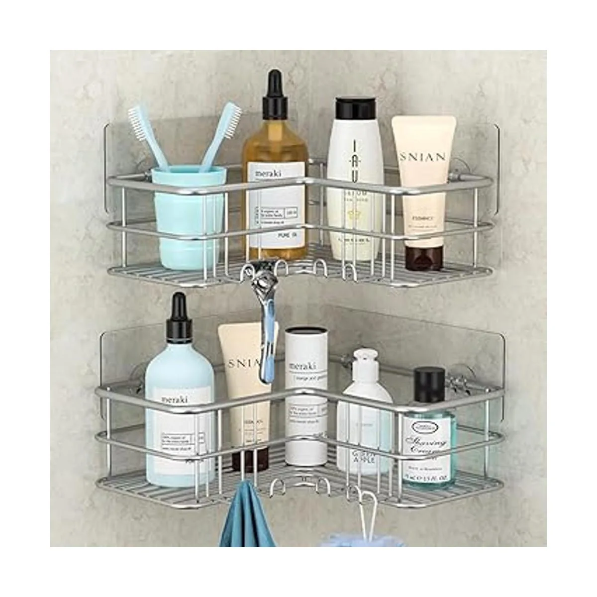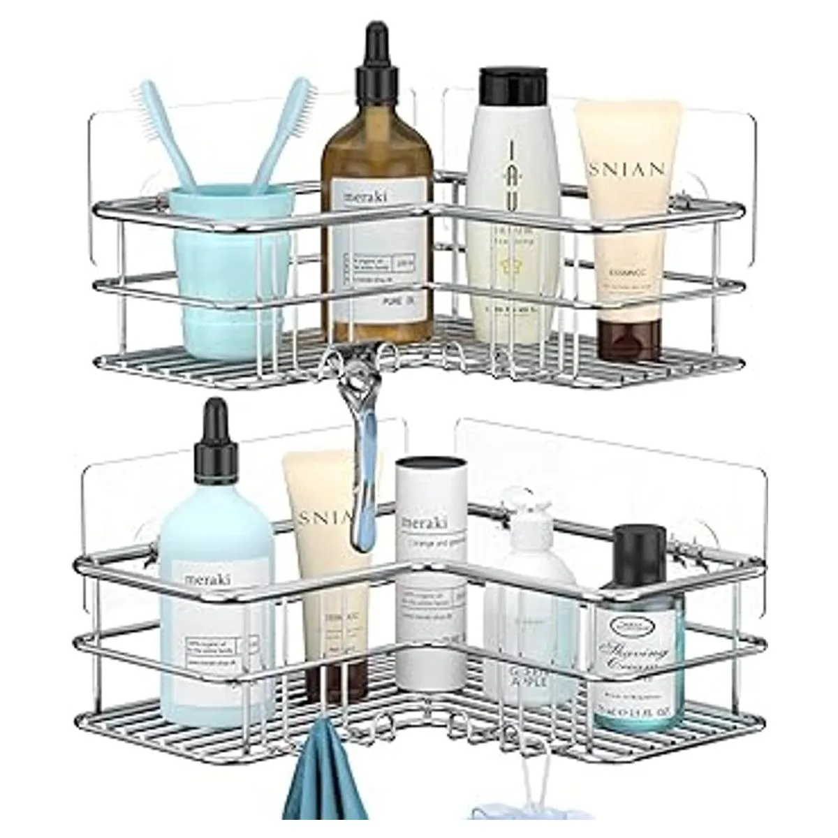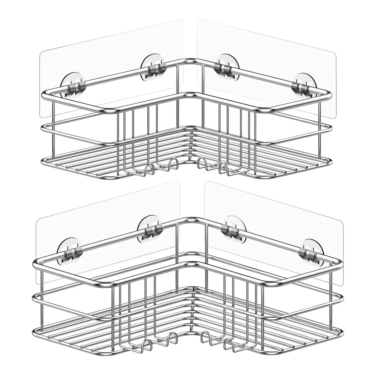 Menbyci Organizador de ducha esquinero, estante de ducha adhesivo con ganchos, organizador de almacenamiento de baño de acero inoxidable a prueba de óxido, soporte de champú de ducha sin perforación, montaje en pared, paquete de 2
