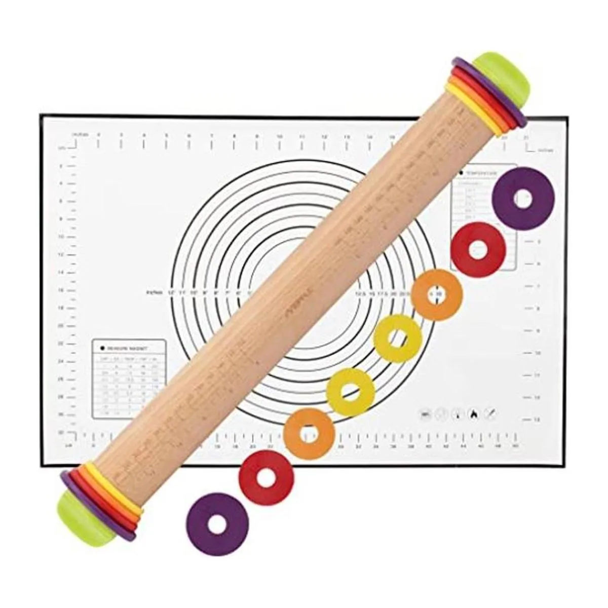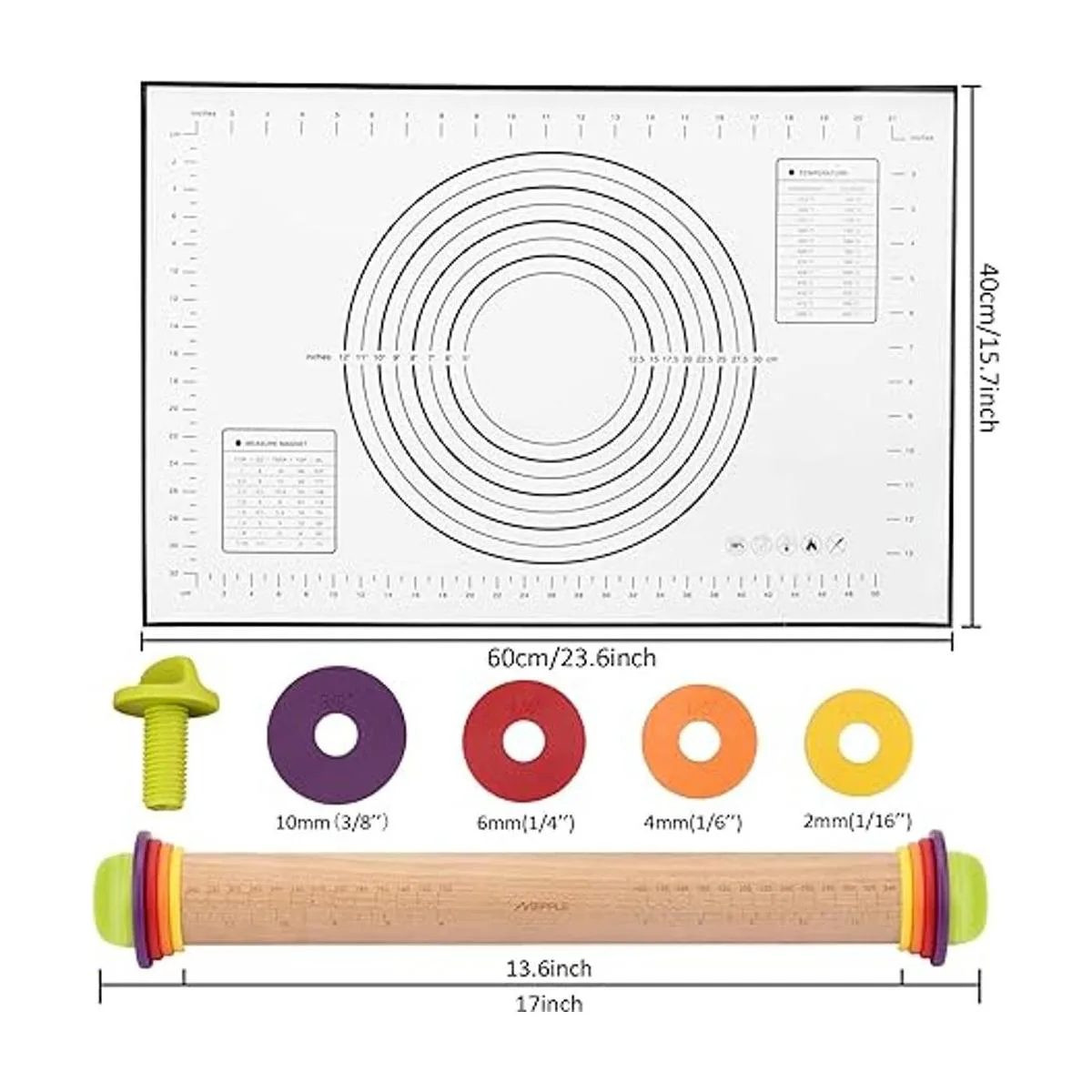Mepple Rodillo con anillos de grosor y alfombrilla para hornear pastelería, rodillo de masa de madera ajustable de 13.6 pulgadas para hornear galletas y pizza, viene con alfombrilla grande de silicona para pastelería, herramientas de cocina para hornear