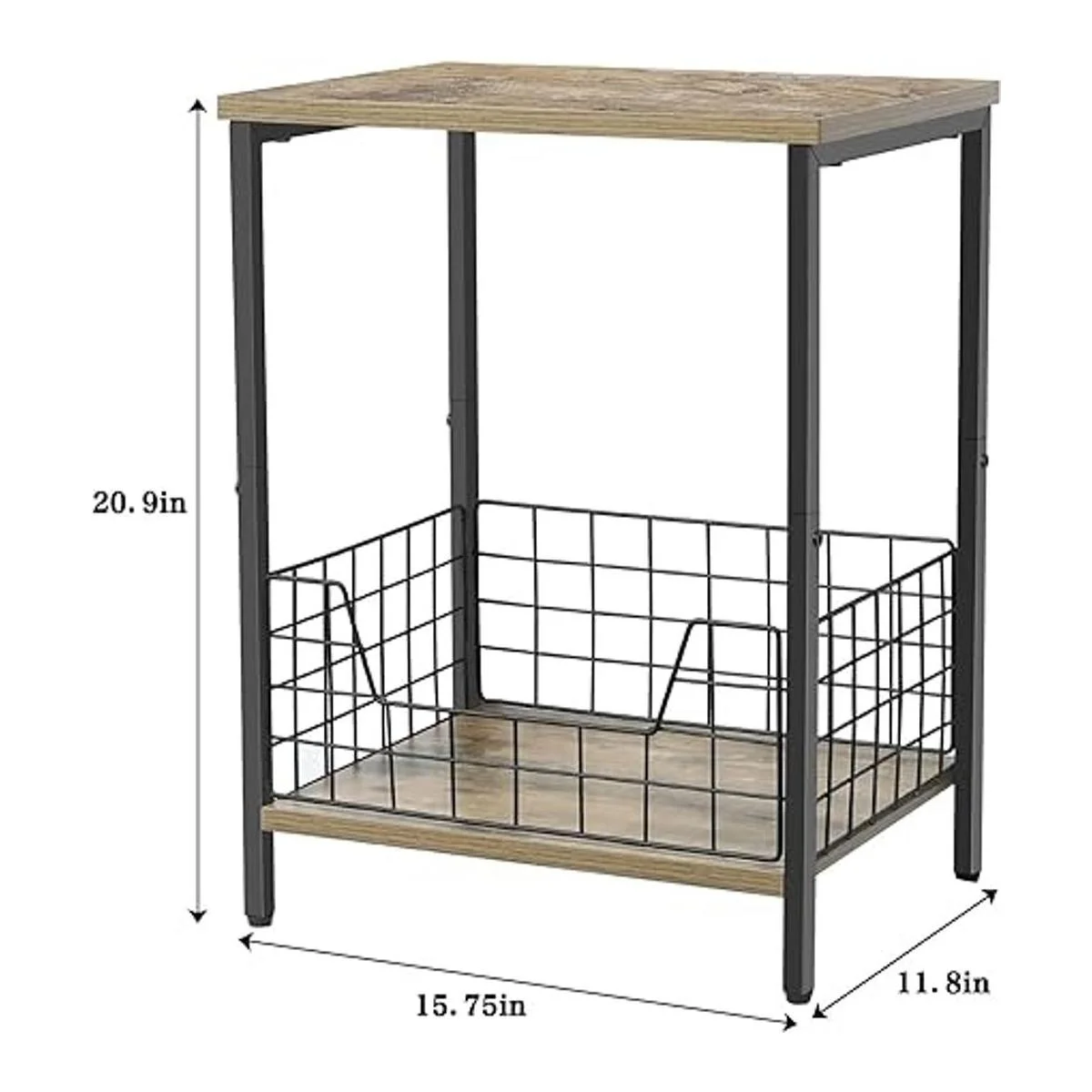 Mesa auxiliar de 2 niveles, mesa auxiliar retro industrial, soporte para reproductor de discos con almacenamiento de álbumes de discos, mesita de noche pequeña para sala de estar, dormitorio, cocina, oficina, espacios pequeños, marrón rústico y negro