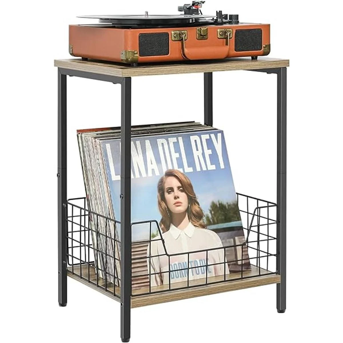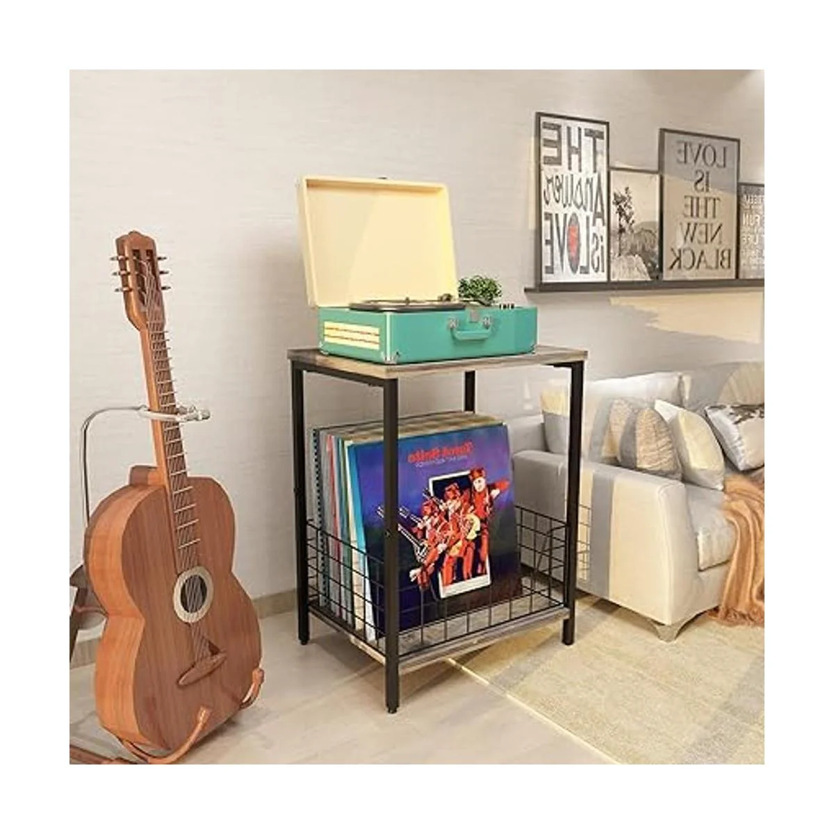 Soporte para reproductor de discos: mesa auxiliar de 2 niveles para almacenamiento adicional que satisface todas tus diferentes necesidades. El estante superior abierto suave proporciona suficiente espacio de almacenamiento para almacenar y mostrar. Y la cesta inferior ancha de alambre de hierro en forma de U para un fácil acceso y puede almacenar registros, aperitivos, latas u otras cosas que quieras poner en el interior
