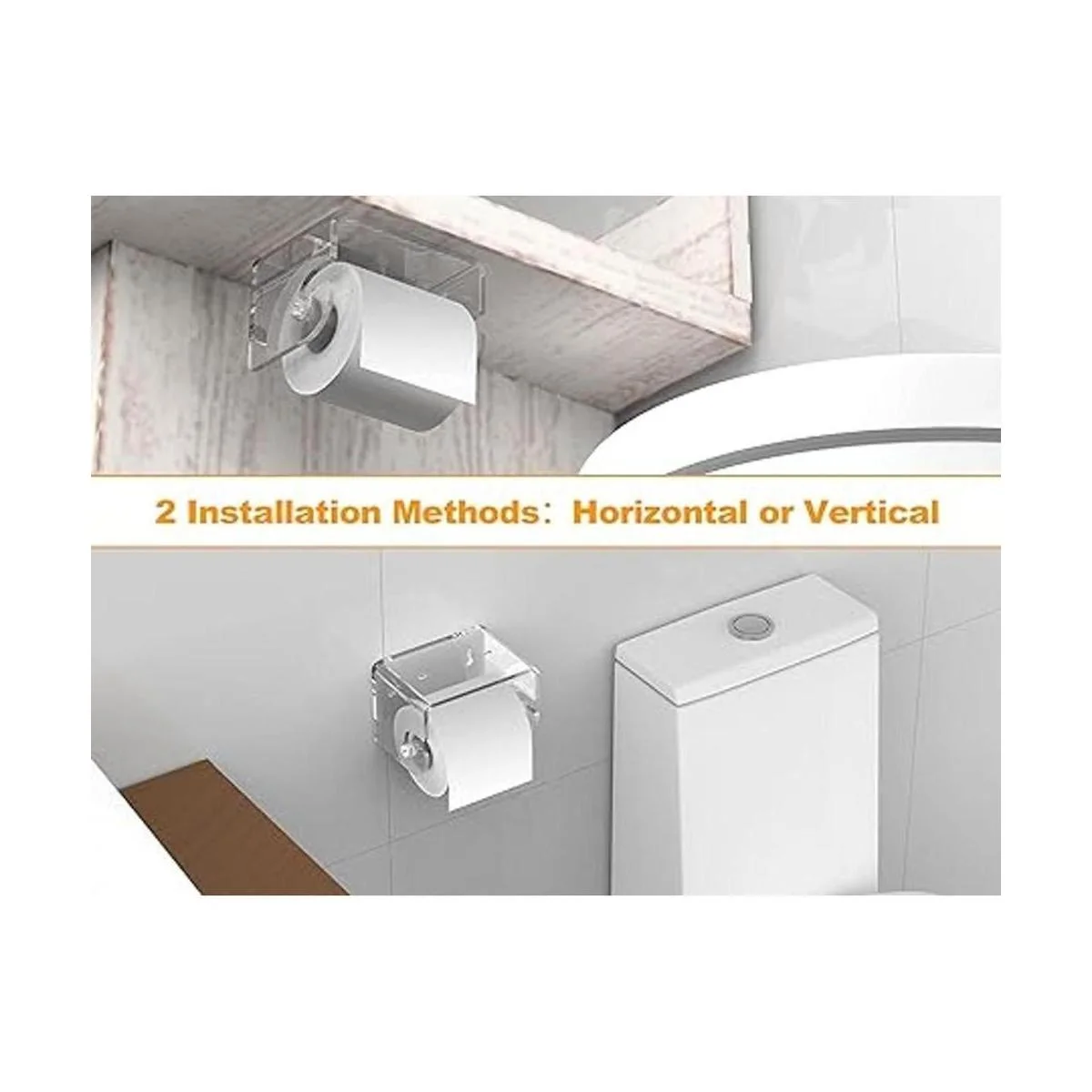 Dos métodos de instalación: 3M autoadhesivo y montaje en pared con tornillo. Nuestro soporte para papel higiénico está equipado con la fuerte pegatina autoadhesiva 3M, adecuado para superficies lisas sin polvo ni manchas de agua. Por lo tanto, nuestra almohadilla adhesiva funciona bien en una zona húmeda y húmeda, ajuste perfecto para los campistas. O si quieres ser más estable y no te importa taladrar, puedes instalarlo con juegos de tornillos montados en la pared. Nuestro soporte de papel higiénico se puede instalar vertical u horizontalmente.