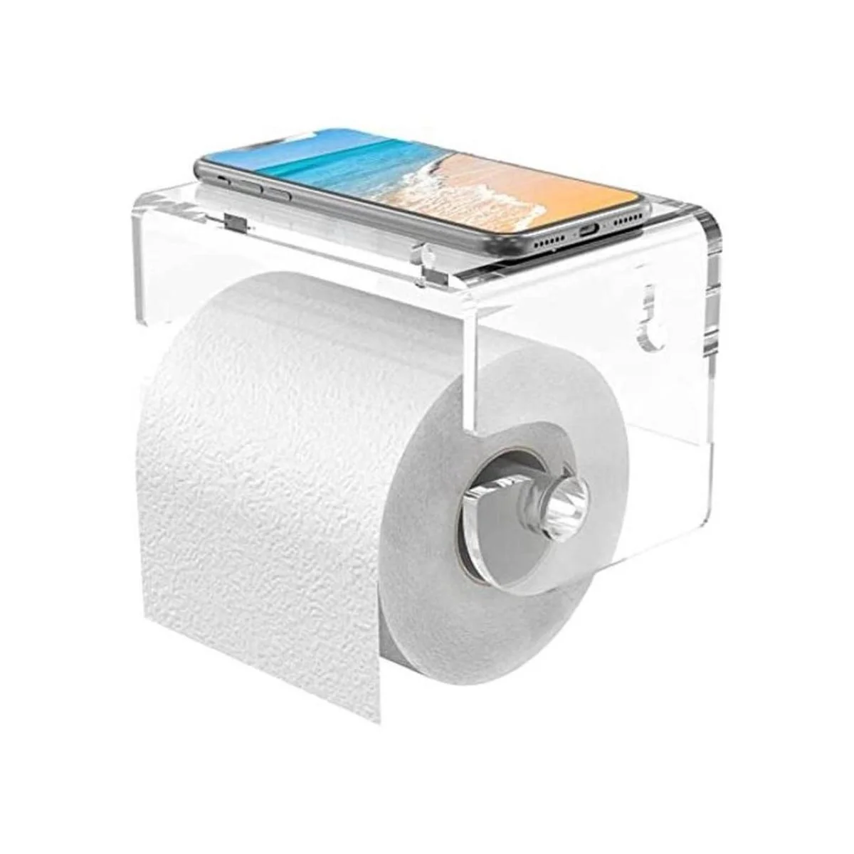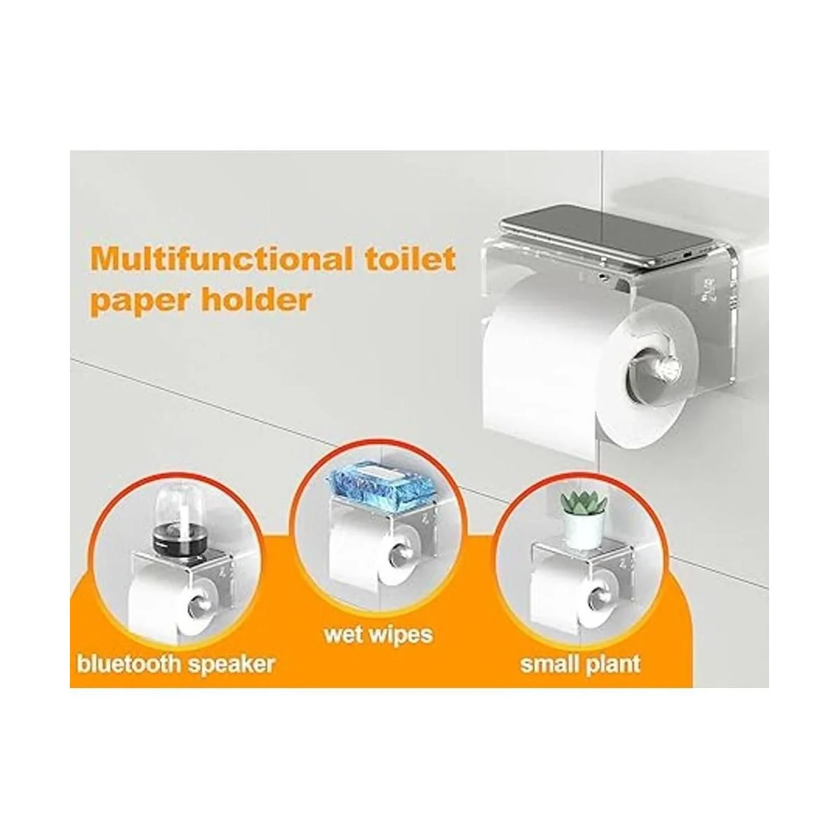 Meteou Soporte adhesivo para papel higiénico con estante, soporte para rollo de papel higiénico acrílico, montado en la pared con autoadhesivo 3M sin perforaciones, soporte para papel higiénico con estante de almacenamiento para baño transparente