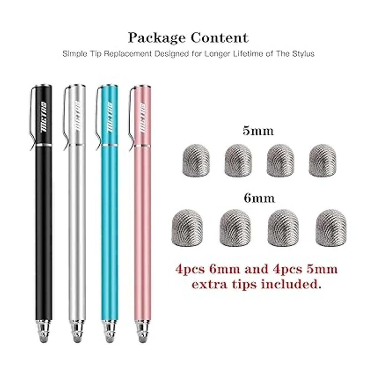 Contenido del paquete: puedes obtener 4 lápices capacitivos de punta de fibra con diferentes colores, 8 puntas de goma adicionales 4 puntas de fibra pequeñas y 4 grandes. 30 días de devolución de dinero por cualquier insatisfacción. Si necesitas más consejos de reemplazo, busca ASIN: B08M3MJSLR.