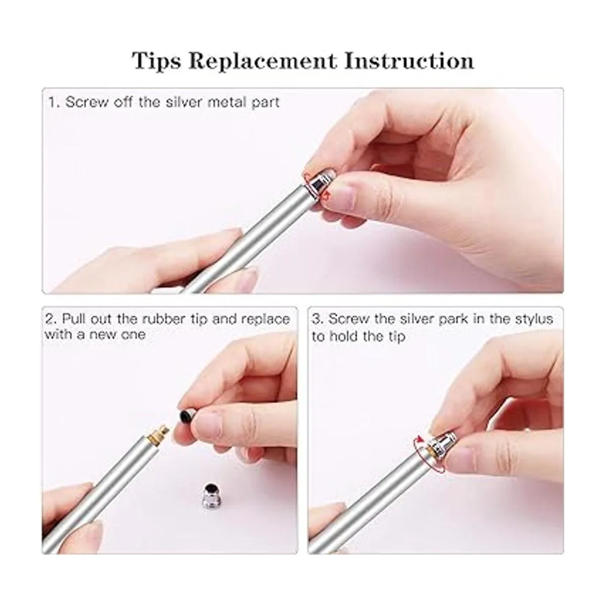 Función de punta reemplazable Ambos extremos de goma son reemplazables. El reemplazo se puede hacer en cuestión de segundos sin herramientas. 8 puntas de fibra de repuesto adicionales incluidas, prolongan eficazmente la vida útil del lápiz capacitivo.