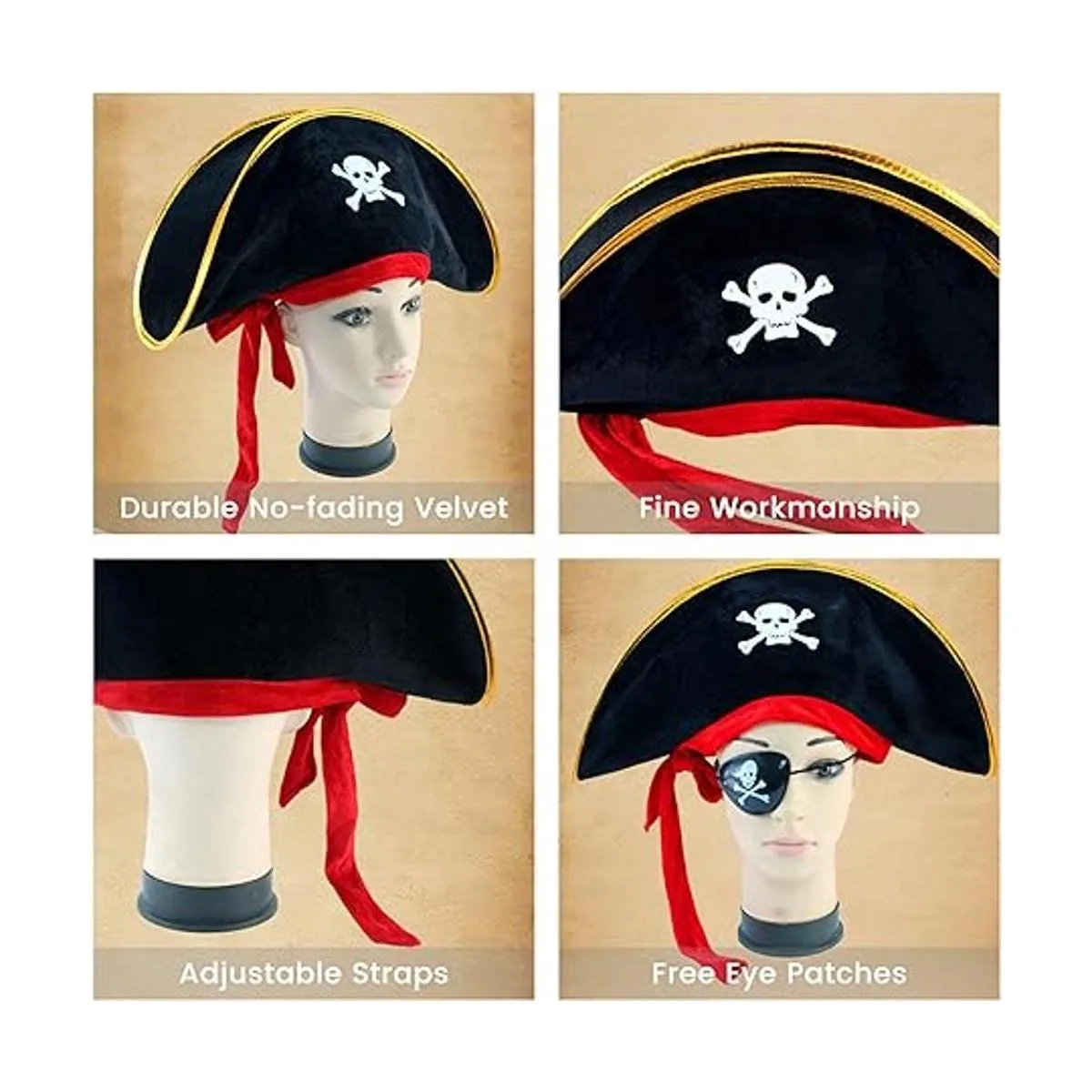 Tela: el sombrero pirata está hecho de terciopelo. Estos sombreros piratas están hechos de telas suaves de alta calidad, con una textura ligera y cómodo de llevar en tu cabeza.