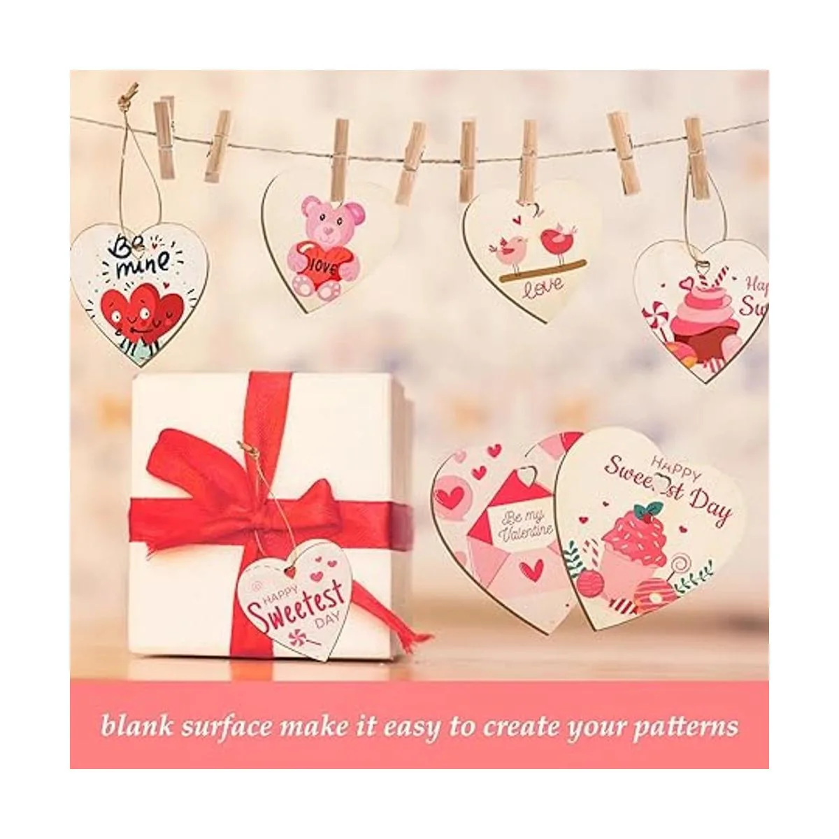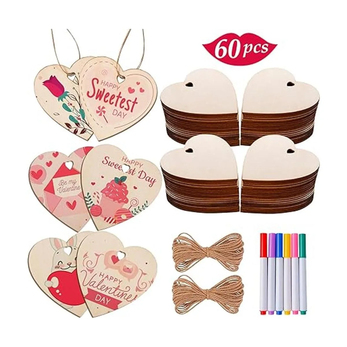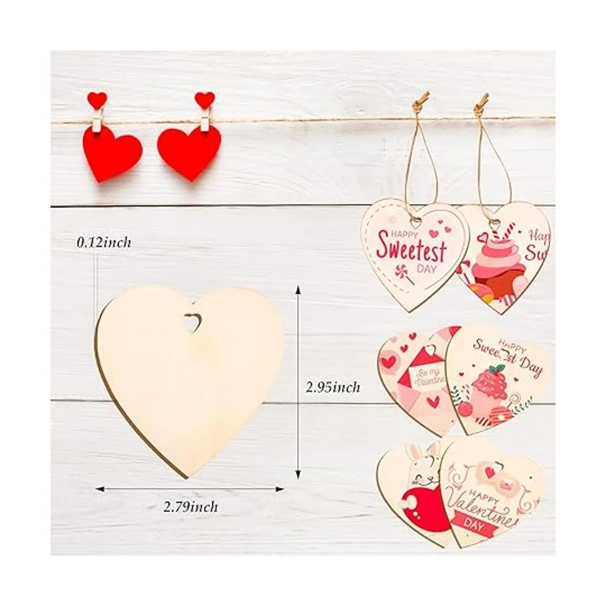 MGParty 60 piezas de rebanadas de madera de corazón natural, adorno para el día de San Valentín a granel para manualidades, decoraciones colgantes de madera pintable sin terminar, kit de madera para manualidades