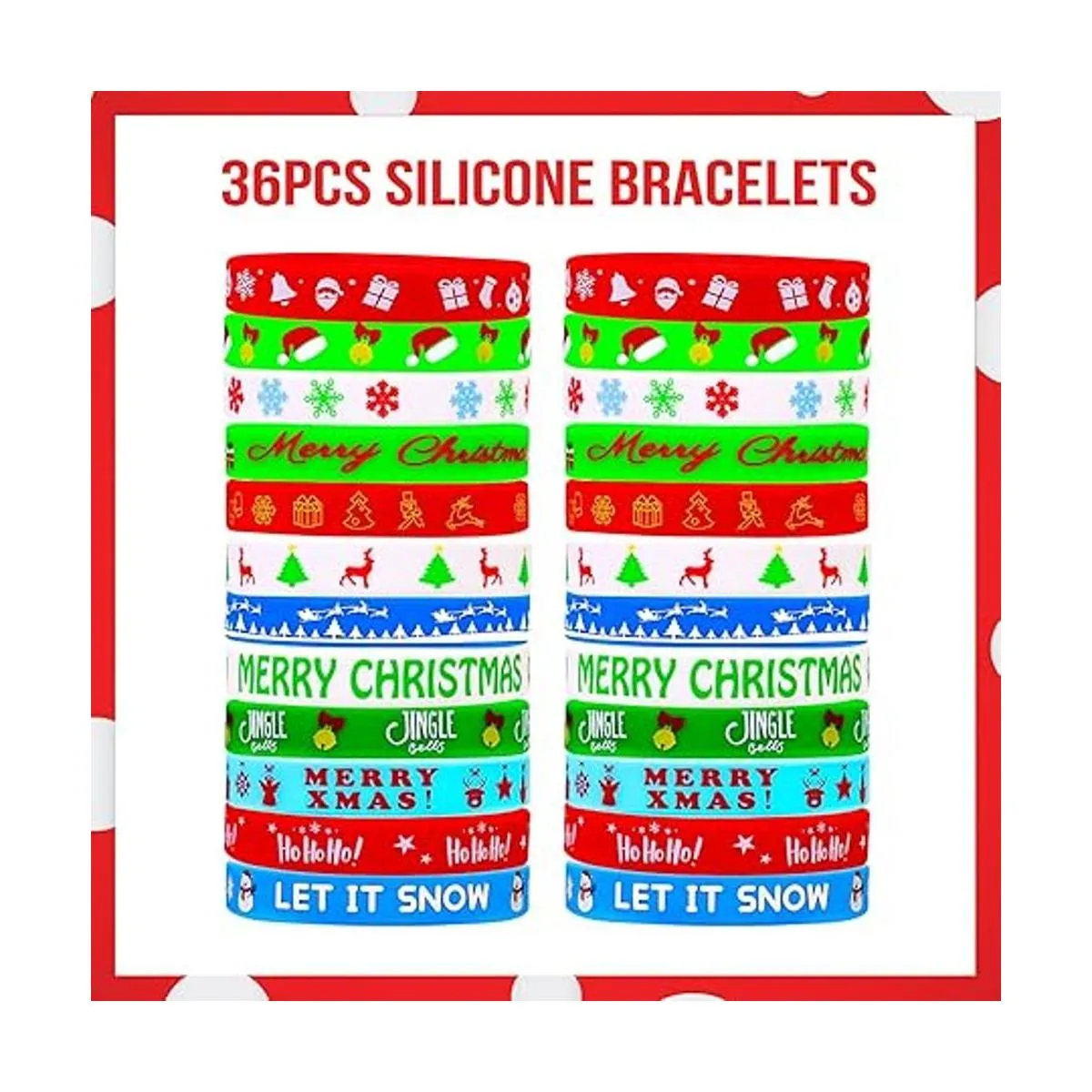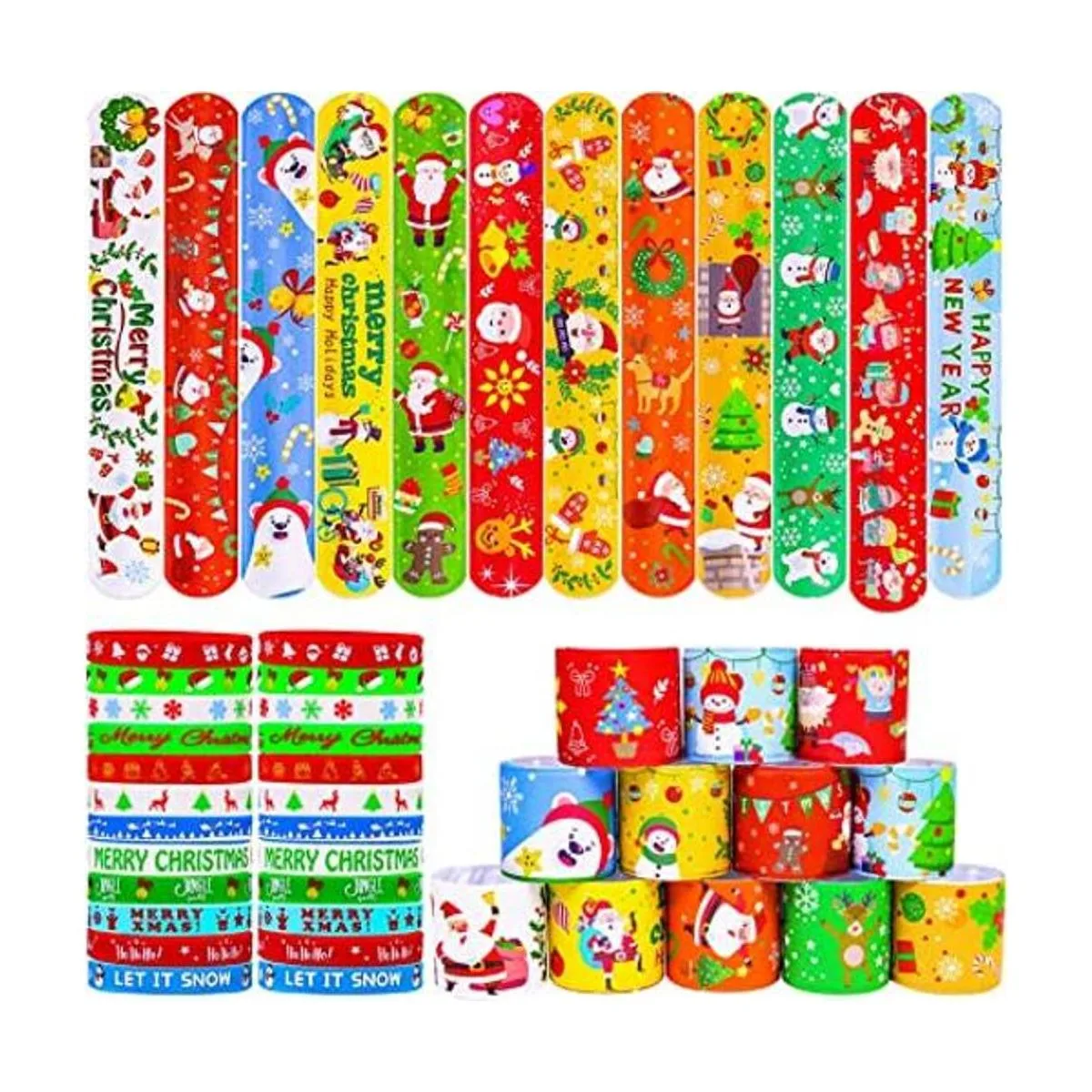 El paquete incluye: 72 pulseras de Navidad en total, 24 diseños diferentes, 3 de cada diseño. Diseñado con árbol de Navidad, muñeco de nieve, sombrero de Navidad, Santa, Elfin, cascabel, caramelo, etc. Una variedad de cantidad y estilo para elegir, puedes entregarlos como quieras en fiestas y disfrutar del festival con familiares y amigos.