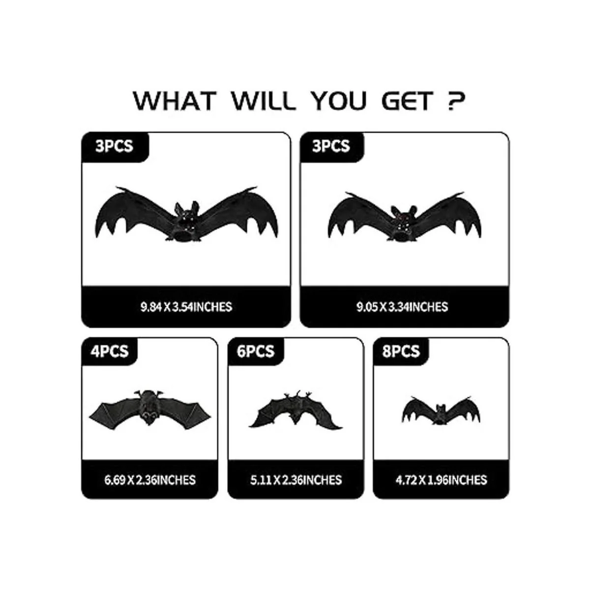 Bates de decoración de Halloween de 5 tamaños: 3 piezas de 9.84 x 3.54 pulgadas, 3 piezas de 9.05 x 3.34 pulgadas, 4 piezas de 6.69 x 2.36 pulgadas, 6 piezas de 5.11 x 2.36 pulgadas, 8 piezas de 4.72 x 1.96 pulgadas. Los murciélagos de Halloween tienen una variedad de tamaños, puedes elegir el tamaño adecuado de decoración de Halloween al aire libre de acuerdo a tus necesidades. Es una rica decoración espeluznante de Halloween.
