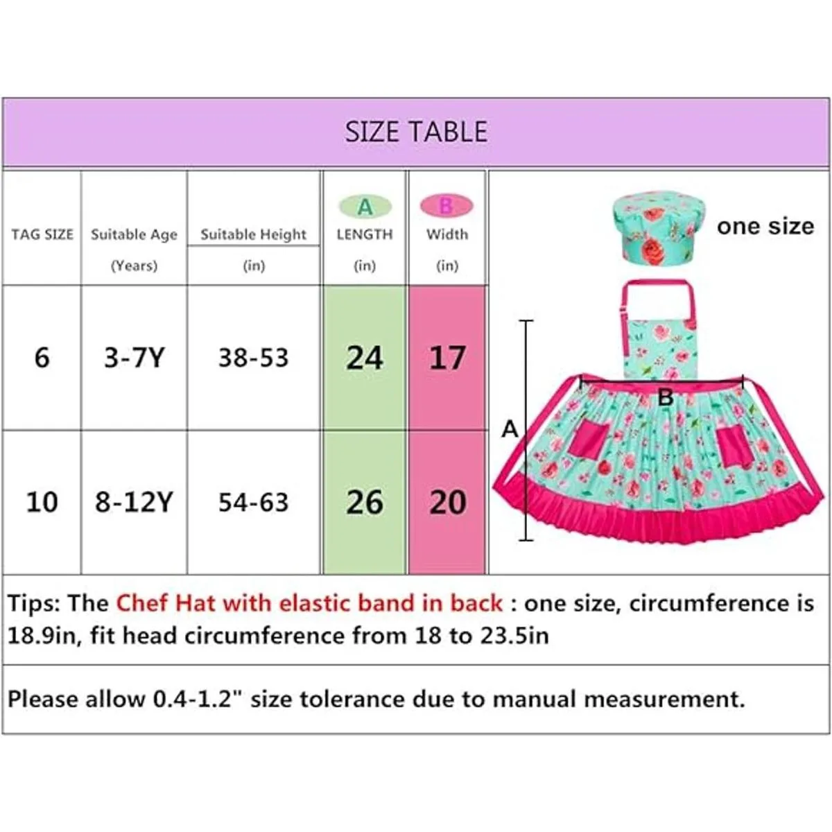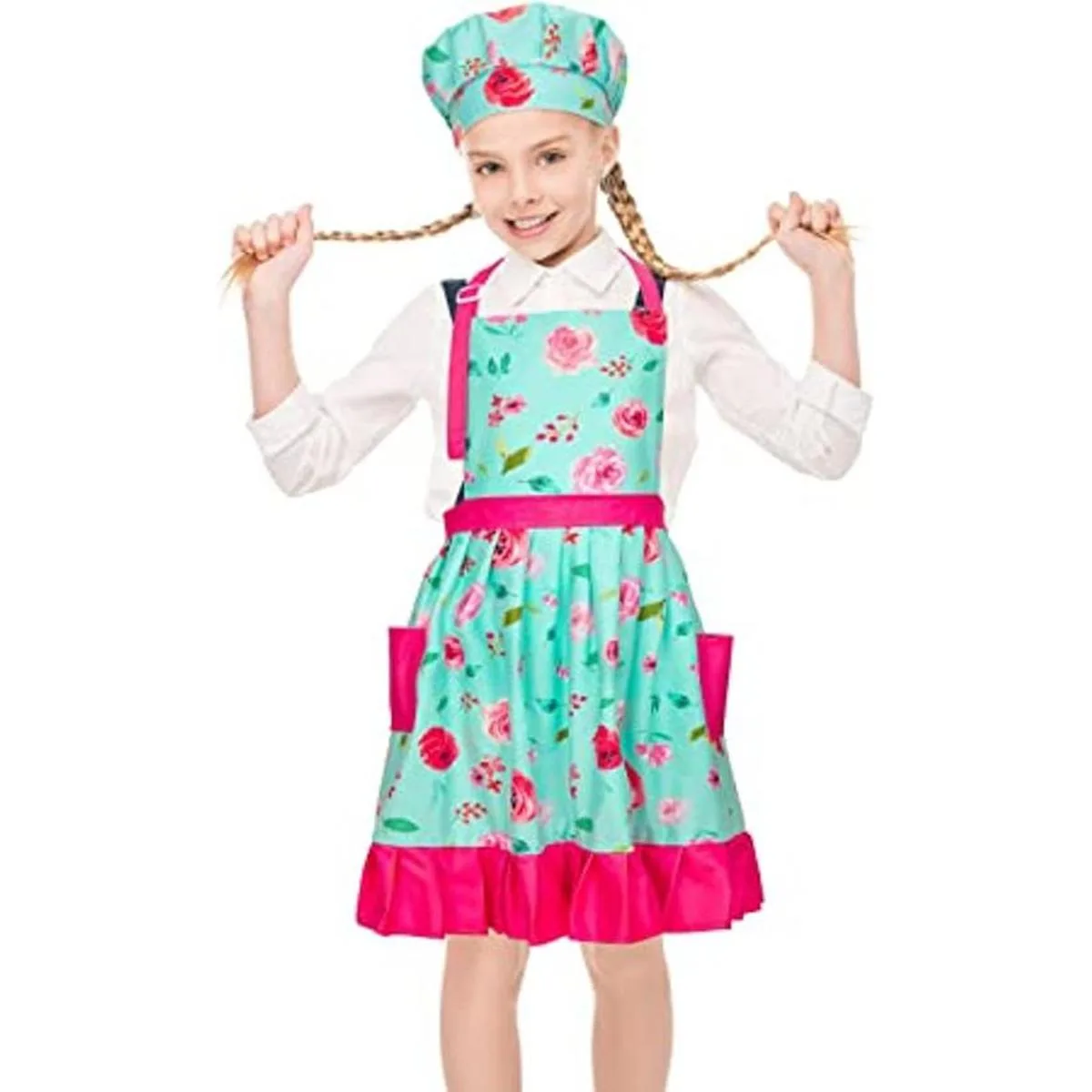 Delantal para niños con sombrero de chef : el juego de gorro de flores florales MHJY está hecho de tela de poliéster de alta calidad, suave, ligera y resistente al desgaste, duradero. Fácil de limpiar, lavable a máquina, secar en secadora a baja temperatura.