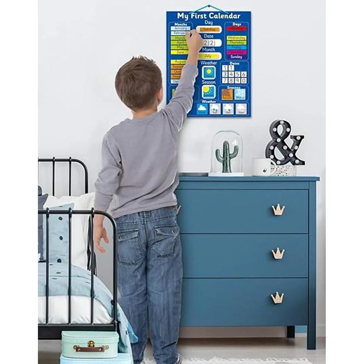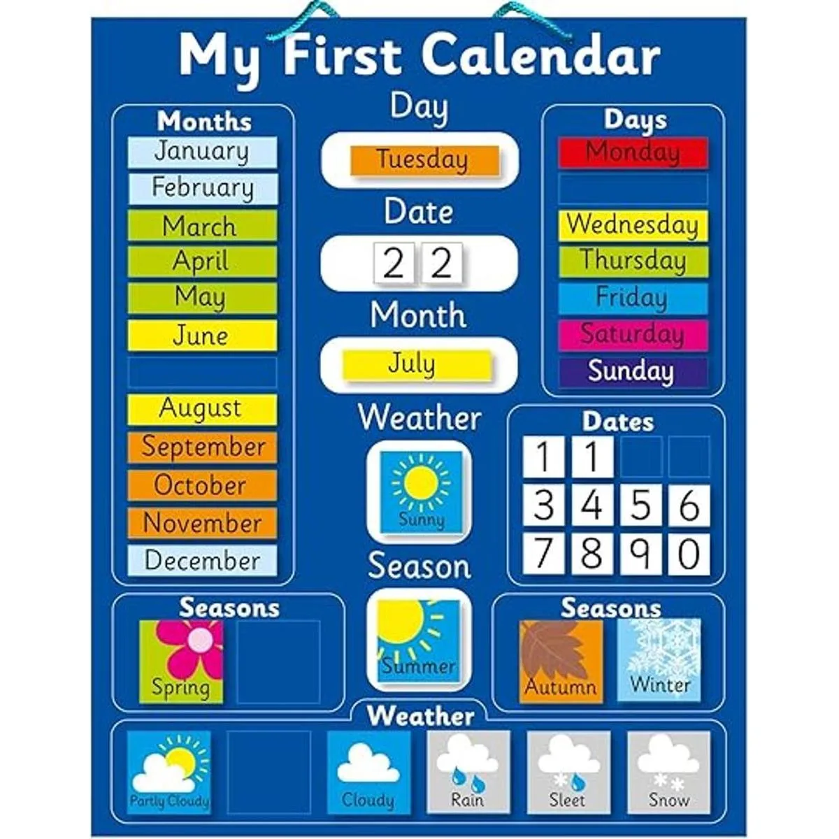 Mi primer calendario educativo magnético, pizarrón rígido azul, 16 x 13 pulgadas con anilla para colgar diseñado en el Reino Unido y muy vendido en Amazon del Reino Unido versión en inglés