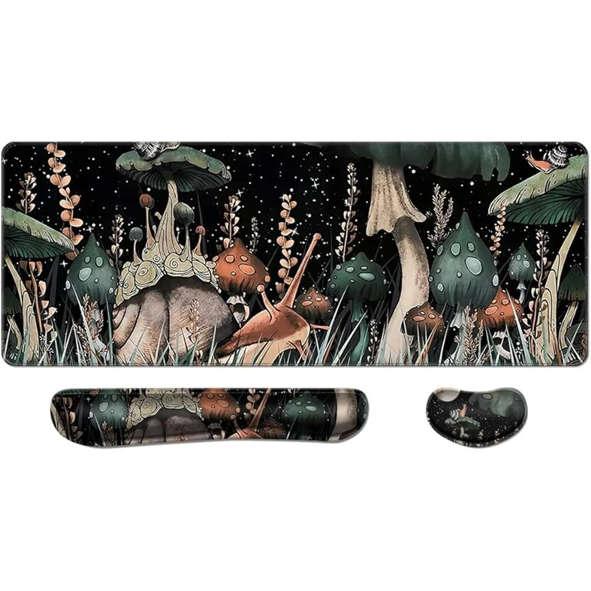 MIBITRI Juego de alfombrilla de mouse para teclado, almohadilla de mouse extendida para juegos soporte ergonómico para reposamuñecas para teclado, espuma viscoelástica, alivio del dolor fácil de escribir, 3 piezas XXL ultra grueso, caracoles y hongos