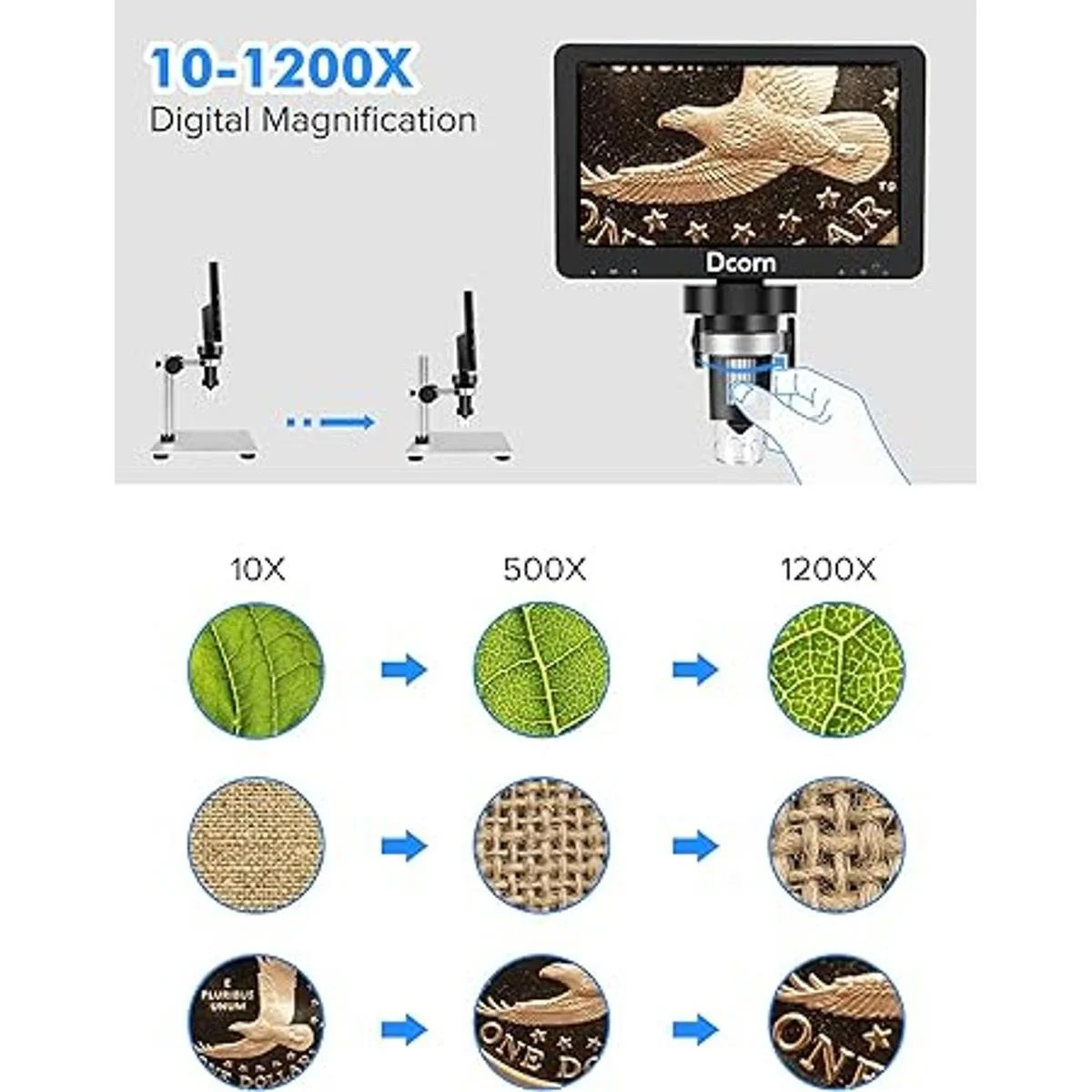 Aumento 50X1200X: el microscopio digital Dcorn permite acercar y observar la textura metálica de las monedas, las venas de las hojas, las líneas de la piel y los componentes electrónicos de la placa de circuito en el rango de aumento de 10X a 1200X. Tú y tus hijos disfrutarán de un maravilloso mundo micro. Además, el aumento real varía dependiendo del tamaño de la pantalla y la distancia entre la lente y el objeto de observación.