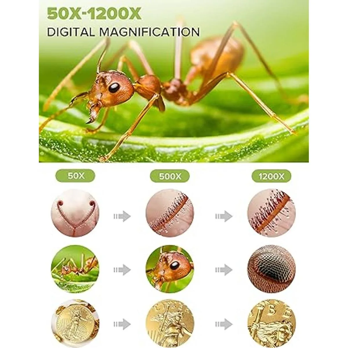Fácil de enfocar: ajusta el objeto para que esté cerca de la lente 0.8 in3.9 in, luego puedes obtener una imagen clara girando lentamente la rueda de enfoque, también puedes presionar el botón hacia arriba o hacia abajo para cambiar el tamaño de la imagen entre 1 y 4X, lo que es útil para observar los detalles.