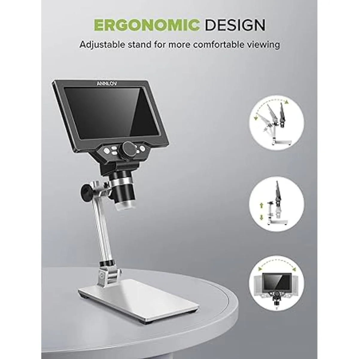Soporte ajustable y metal sólido y base: el material de metal es más fuerte, más estable y más duradero que otras versiones de plástico, minimizando los golpes y manteniendo tu muestra en un enfoque nítido, tendrás una visión más estable y precisa de tu objeto. Al mismo tiempo, puedes ajustar el soporte según sea necesario para encontrar el mejor ángulo de visión y evitar la tensión ocular y cuello.