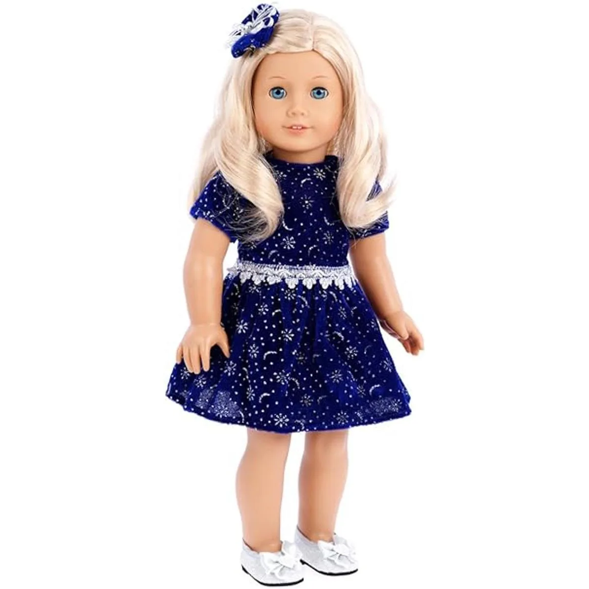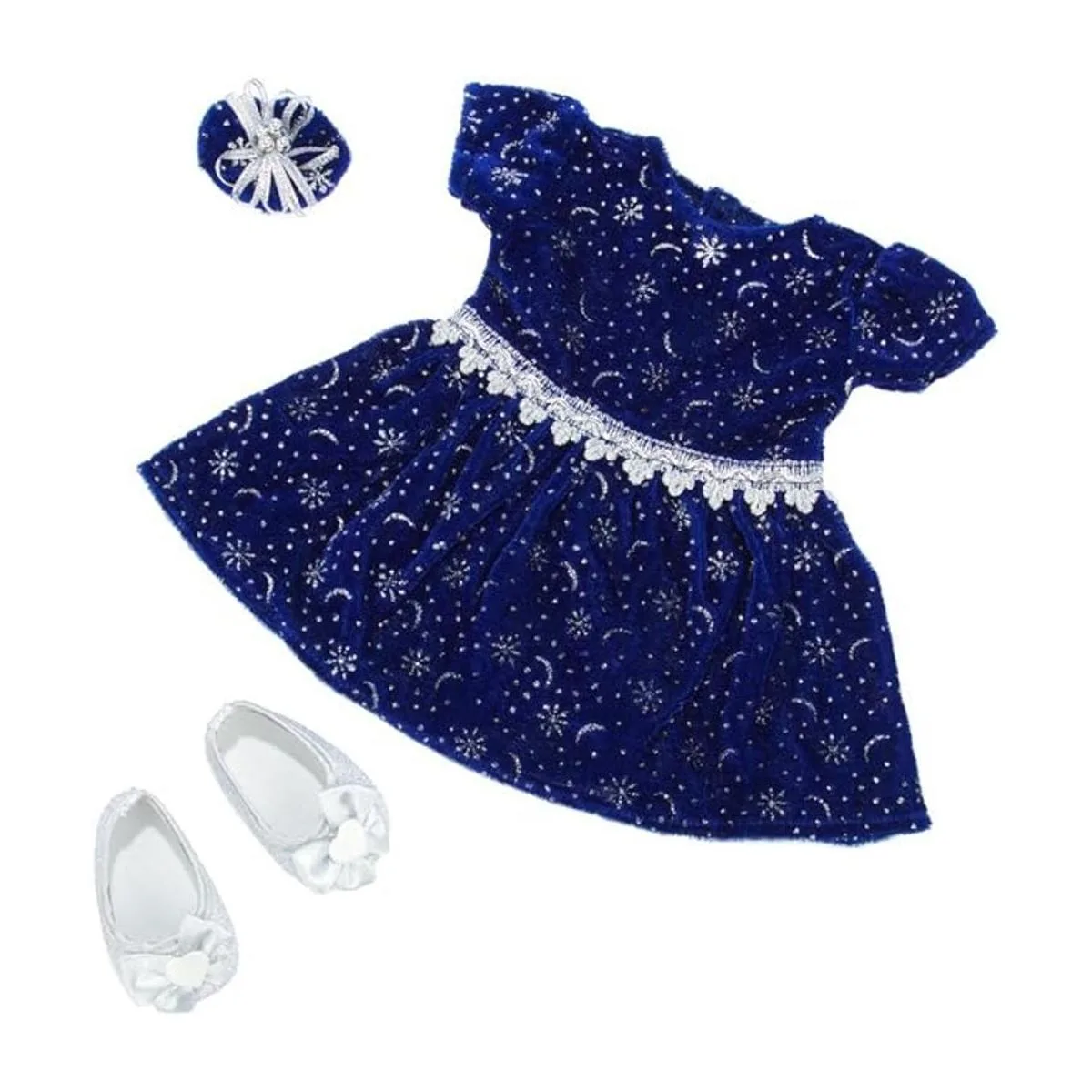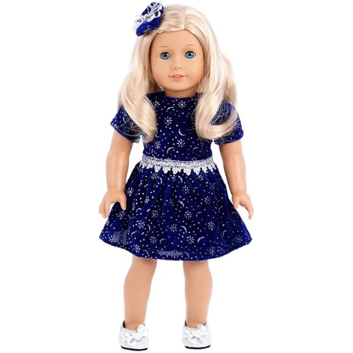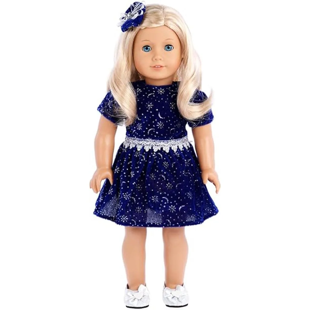Midnight Blue 3 pieza Outfit azul oscuro Sparkling día festivo vestido con Matching Plata Zapatos y Headpiece Ropa de muñecas 18 inch muñeca no incluido