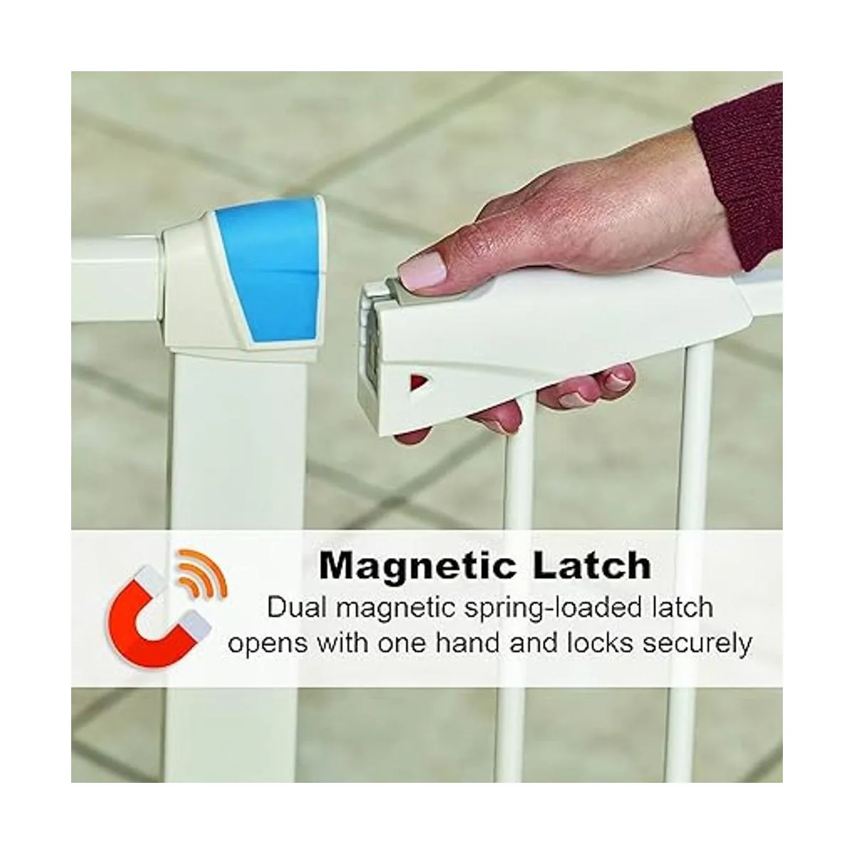 Funcionamiento con una sola mano con pestillo magnético seguro que alerta a los padres de mascotas de que la puerta de la puerta está cerrada de forma segura. Ten en cuenta que el espacio entre la puerta de seguridad y el pestillo se eliminará cuando la puerta esté completamente instalada