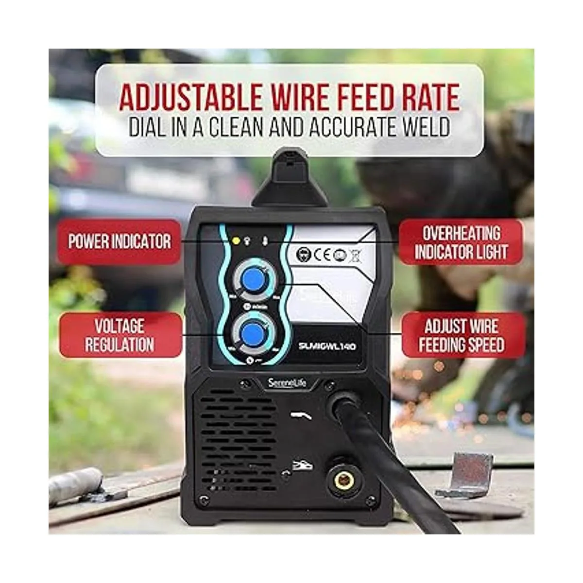 Doble voltaje 110 V/220 V: el soldador MIG incluye enchufe de 220 V y adaptador de 110 V, la máquina cuenta con hasta salida que te permite soldar acero de hasta 0.08 pulgadas. Soportes, alimentador de cable de 24 V con 0,7 KVA/1,8 KVA de potencia máxima y mínima