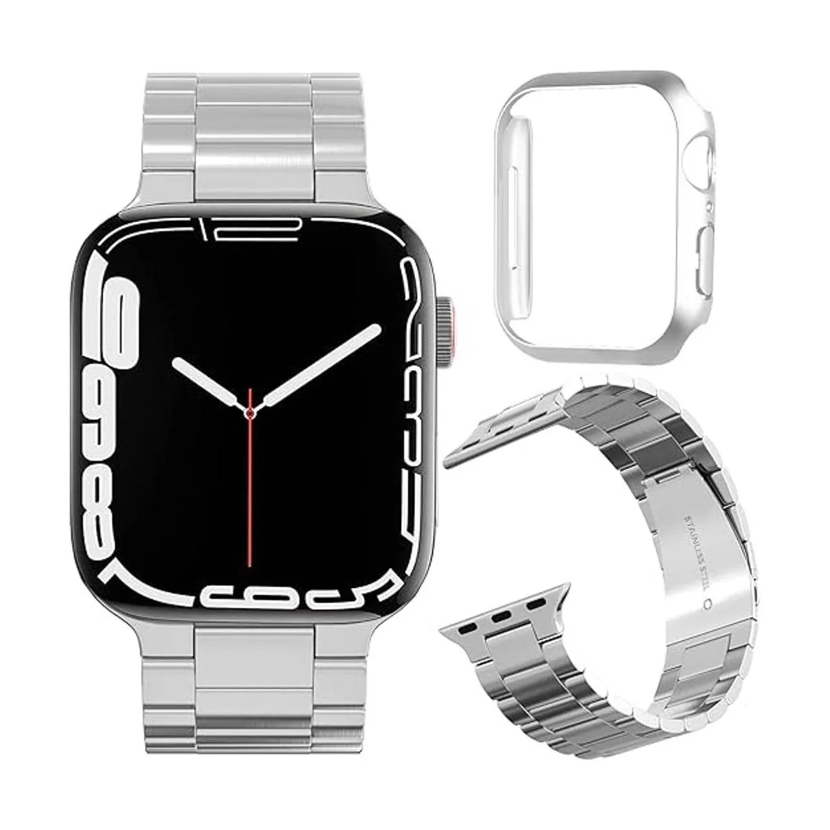 Miimall Correa y carcasa compatible con Apple Watch Series 7 de 1.772 in, acero inoxidable, carcasa delgada y rígida de policarbonato para Apple Watch de 1.772 in, serie 7, color plateado