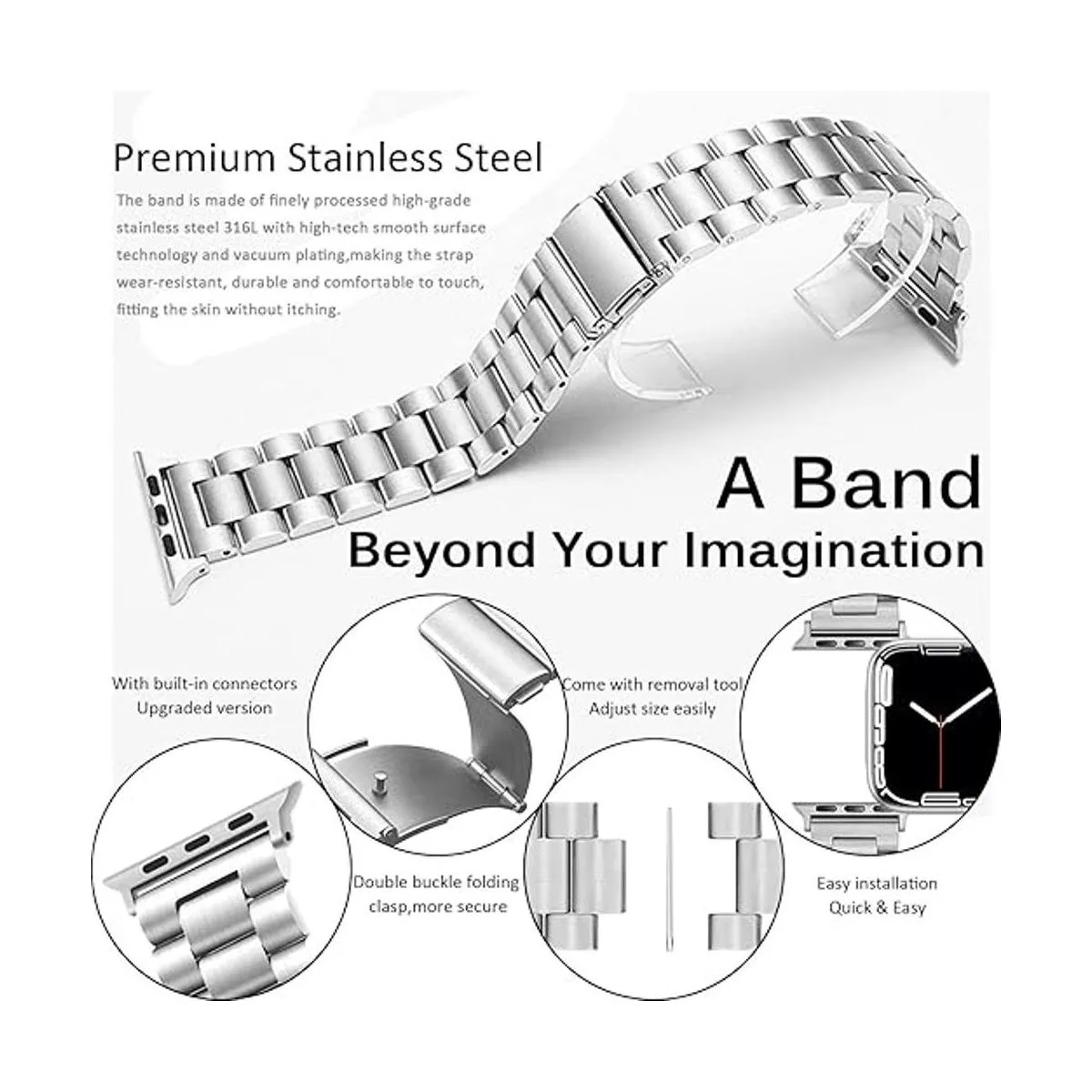 Diseño clásico y atemporal: el diseño de la correa de acero inoxidable está inspirado en el reloj clásico tradicional y combinado con el diseño de correa de Apple Watch 7, lo que hace que la correa sea simple, clásica, moderna y no anticuada. Además, la correa cuenta con un cierre plegable de doble botón que es clásico y práctico, por lo que es fácil de quitar y poner en cualquier momento.