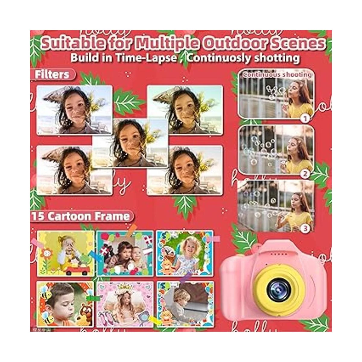 Captura FHD 1080 dulce tiempo y selección de escenas creativas: esta cámara digital para niños está equipada con alta definición HD de 1080P, 5.0 megapíxeles y zoom 4X. Esta cámara para niños tiene 15 marcos divertidos y 5 filtros para que elijas. Los niños pueden tomar varias posturas y enamorarse de tomar fotos. Hay una potente función en el ajuste, como disparo de ráfaga, función de reproducción y captura de retraso. Es una gran opción para regalo de tus niñas.