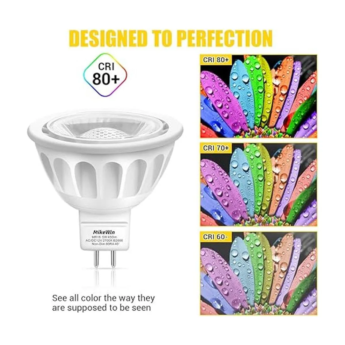 Mikewin Paquete de 10 bombillas LED MR16, 5 W, 12 V, base bipin GU5.3, equivalente a 50 W, blanco cálido, 2700 K, bombillas LED MR16 no regulables para iluminación de pista de paisaje interior y exterior