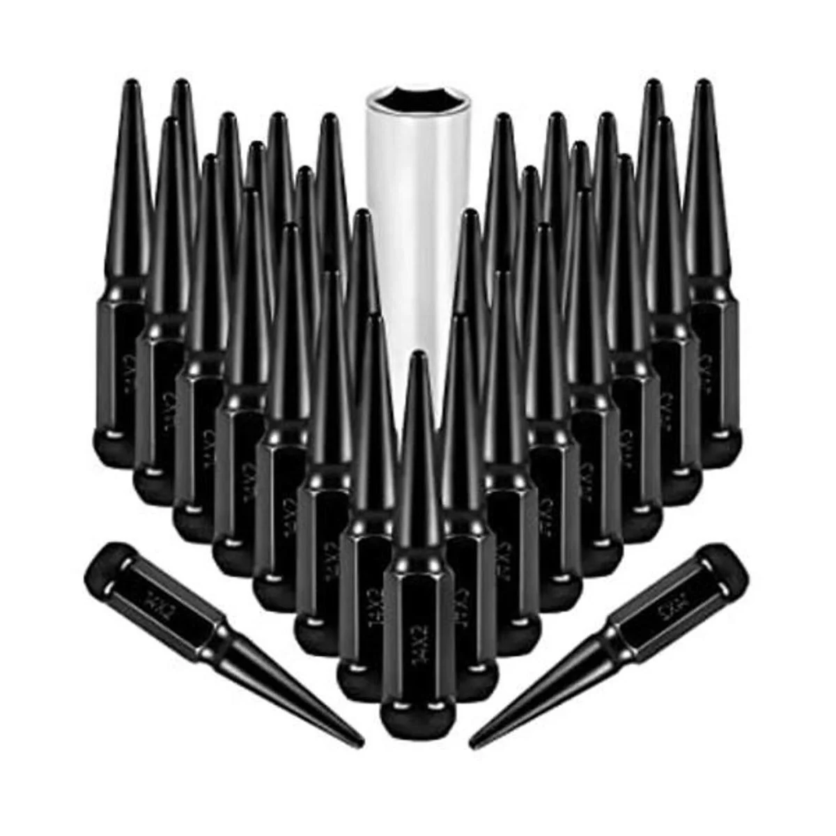 MIKKUPPA Tuercas de pico con paso de rosca M14 x 2.0, 32 tuercas negras, de 4.4 pulgadas de largo, con base en forma de bellota tuercas cónicas, incluye una llave para tuercas, pieza de repuesto para tuercas de rueda