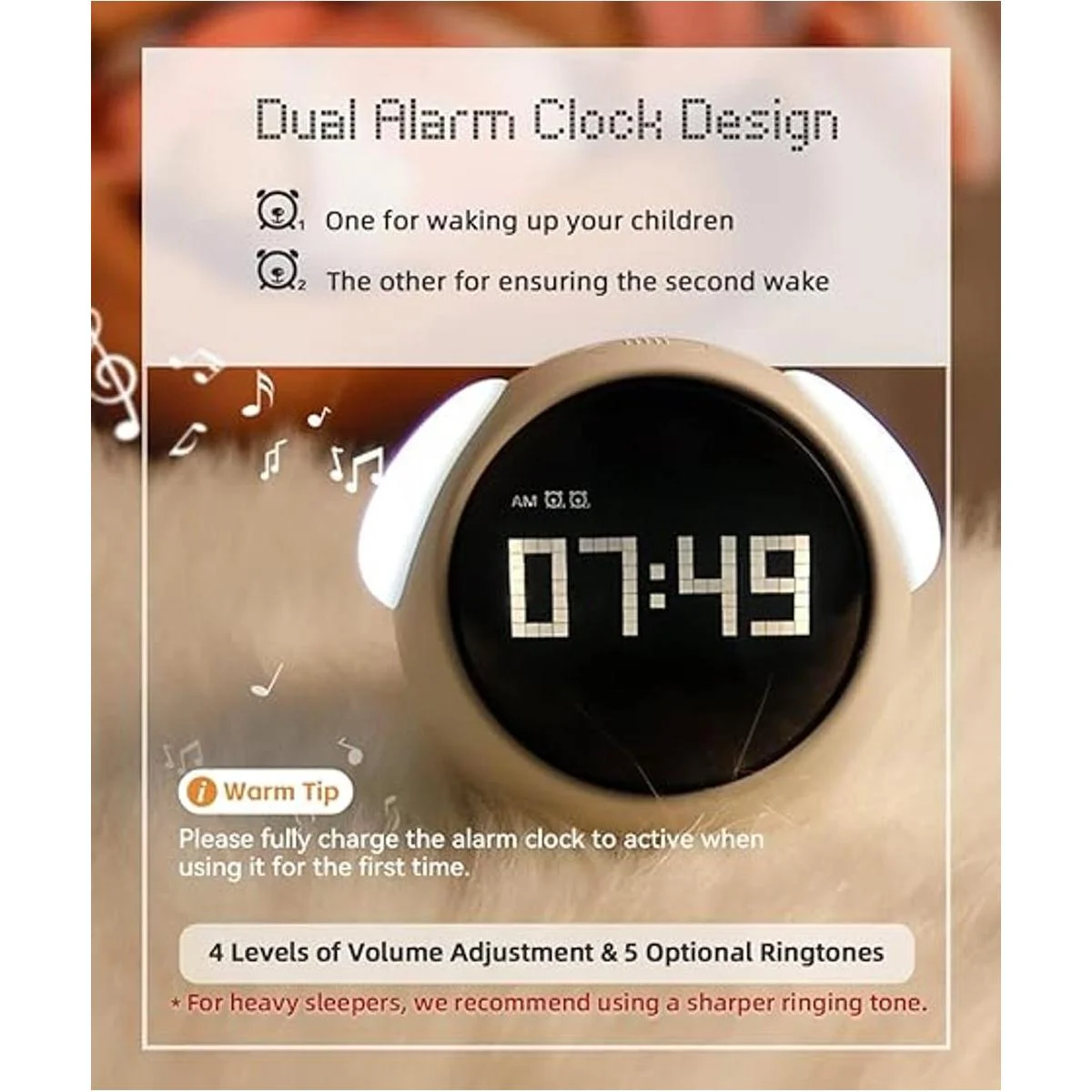 Ajuste de reloj de alarma dual: se pueden configurar dos relojes despertadores, opción humanizada para cambiar libremente. Mientras tanto, hay cinco tonos de llamada para elegir y cuatro niveles de volumen para ajustar. Los niños pueden elegir su tono de llamada favorito y el volumen adecuado para cada reloj despertador, lo que les permite disfrutar configurando el suyo.