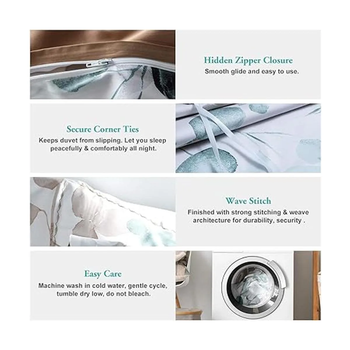 CIERRE DE CREMALLERA Y LAZOS PARA AMARRAR EN LAS ESQUINAS El cierre de cremallera lateral invisible te permite insertar y quitar fácilmente tu edredón. Los cuatro lazos en las esquinas mantienen el edredón en su lugar. Te permite dormir tranquilamente y cómodamente toda la noche.