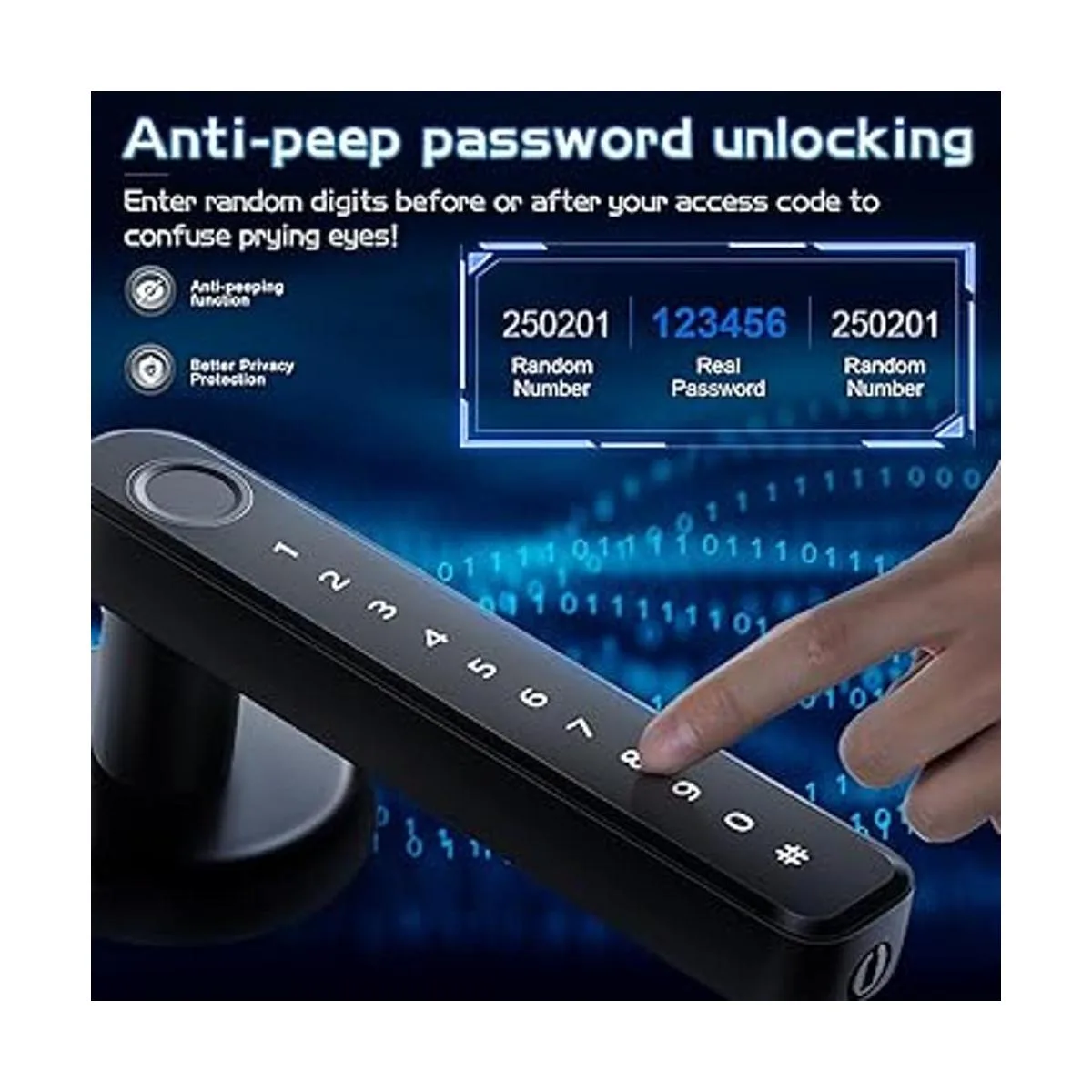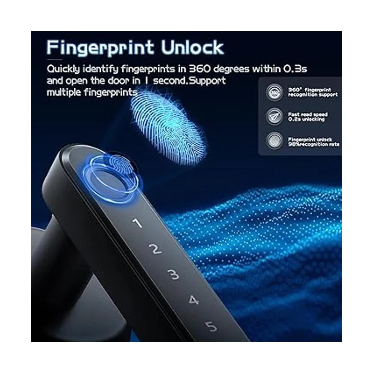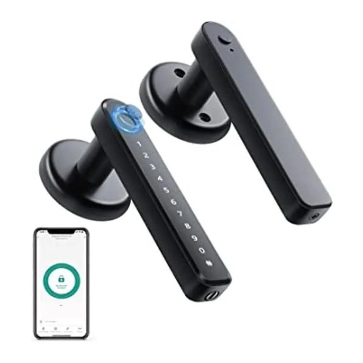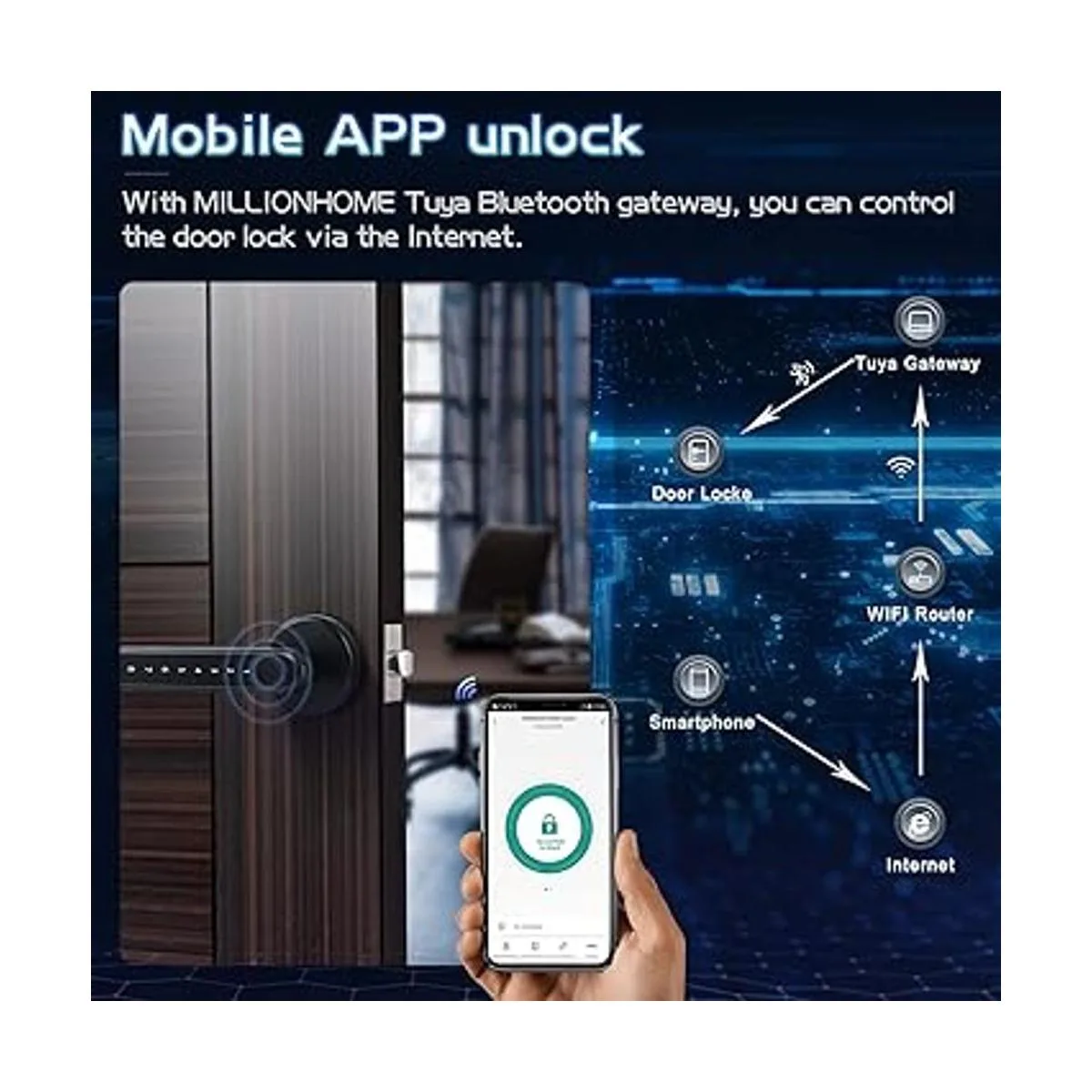 Millionhome Cerradura de puerta por huella dactilar, con aplicación, código, llave de repuesto, perilla con manija y teclado, no necesita llave, para la puerta de entrada del hogar, hotel, oficina, apartamento, dormitorio, color negro