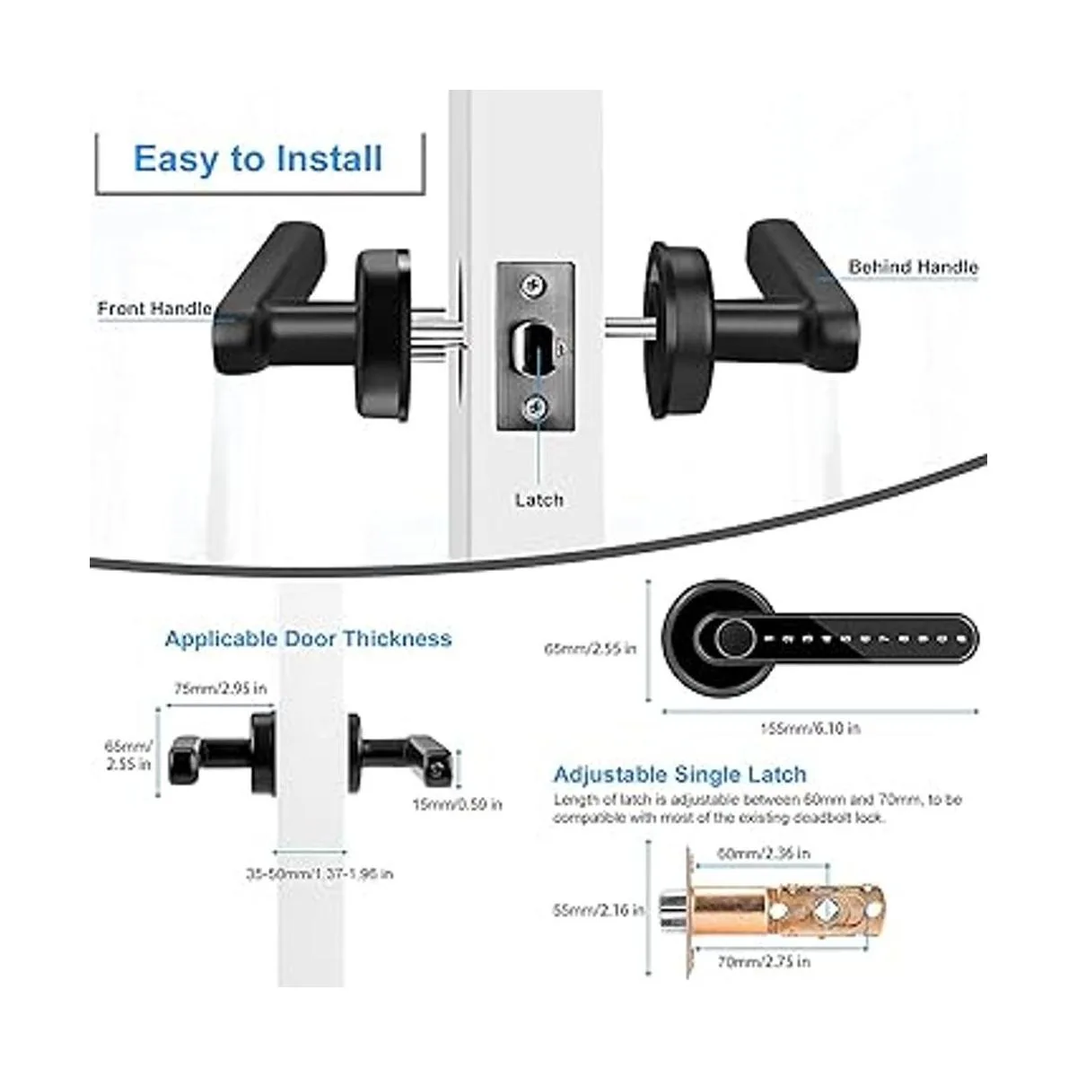Instalación sencilla: La cerradura de puerta por huella digital está diseñada para adaptarse a puertas estándar de EE. UU., tiene una entrada de cerradura de 2.362 pulgadas y 2.756 pulgadas, y el grosor de la puerta es de 1.378 pulgadas a 2.165 pulgadas. No necesita cables ni taladro. Se adapta a las puertas de las personas zurdas y diestras.