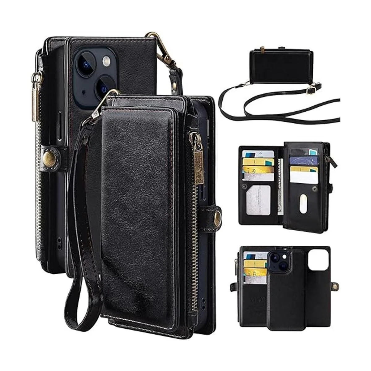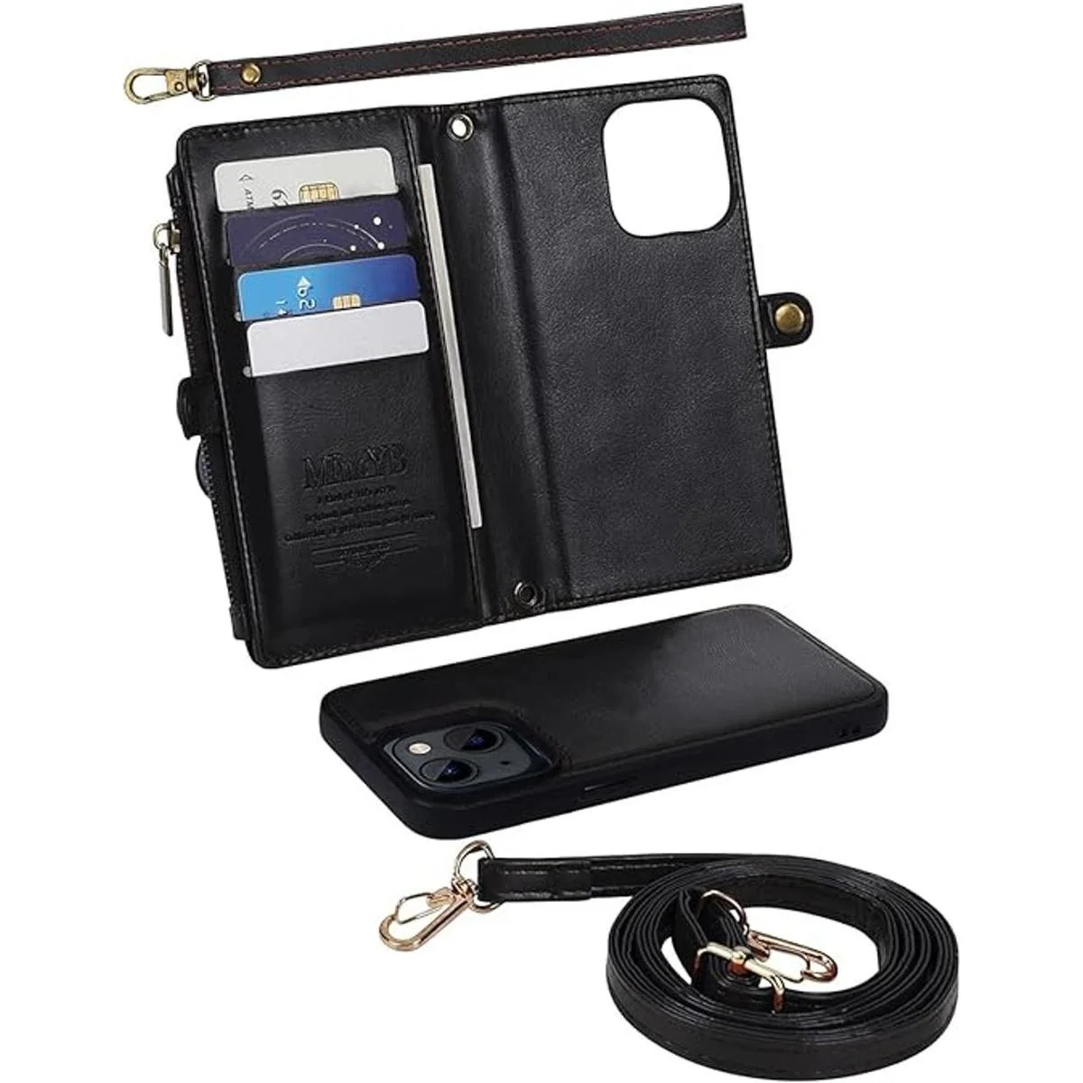 MInCYB Funda tipo cartera compatible con iPhone 13 Pro, funda con cremallera con ranura para tarjetero con bloqueo RFID, bolso magnético desmontable con cremallera con correa de muñeca, funda de cuero para iPhone 13 Pro, color negro