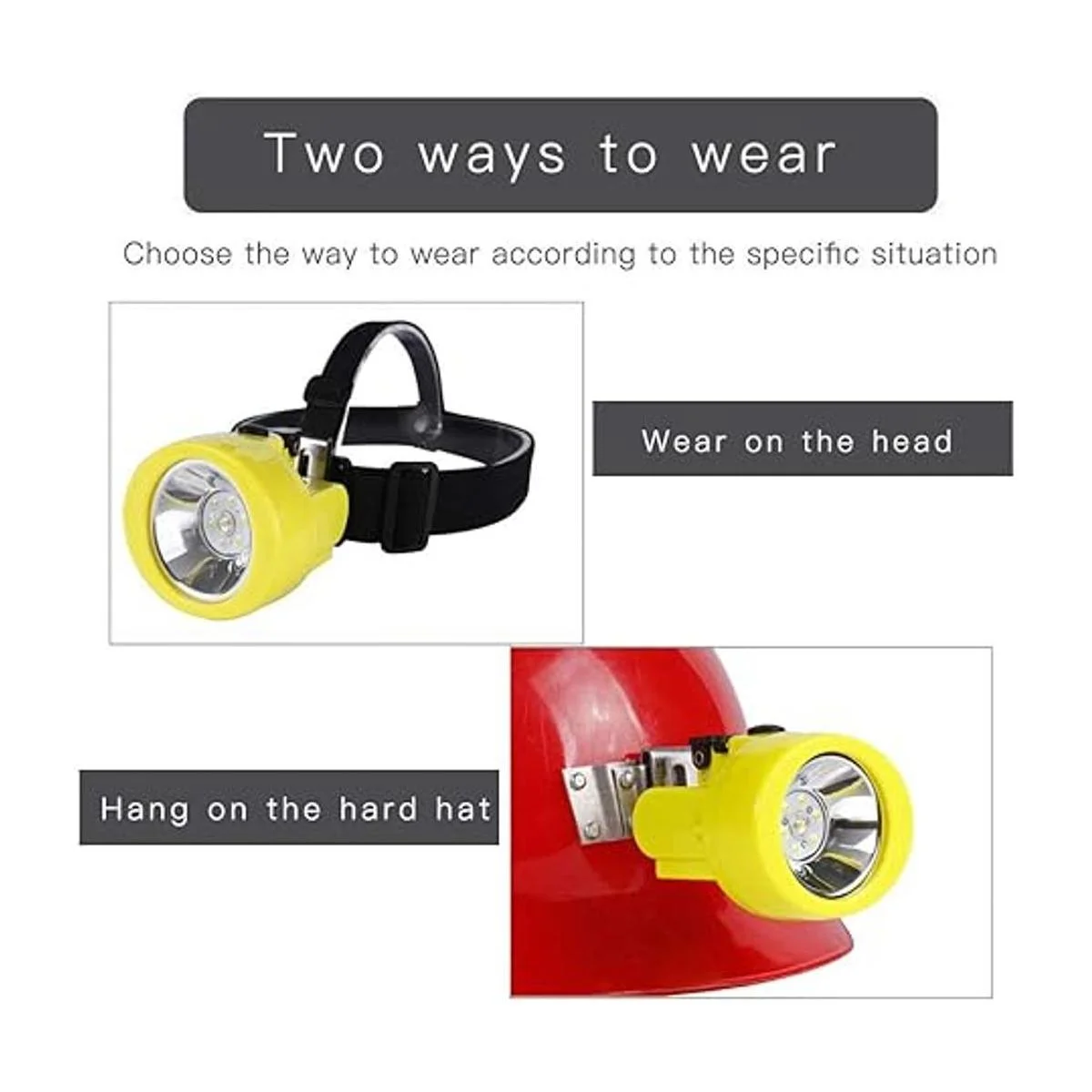 Dos métodos de uso para llevar en la cabeza o colgar en un sombrero duro.