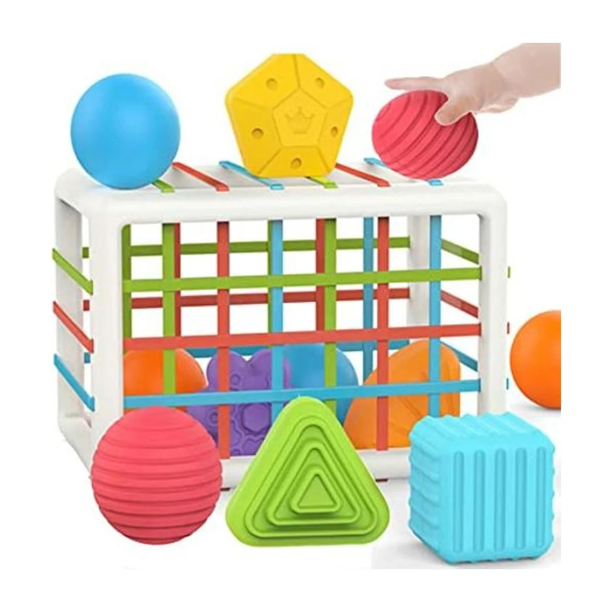 Este es un encantador juguete clasificador de formas que es ideal para bebés o niños pequeños. El recipiente para las formas tiene lados abiertos con tiras elásticas. Las formas se pueden empujar fácilmente dentro y fuera.