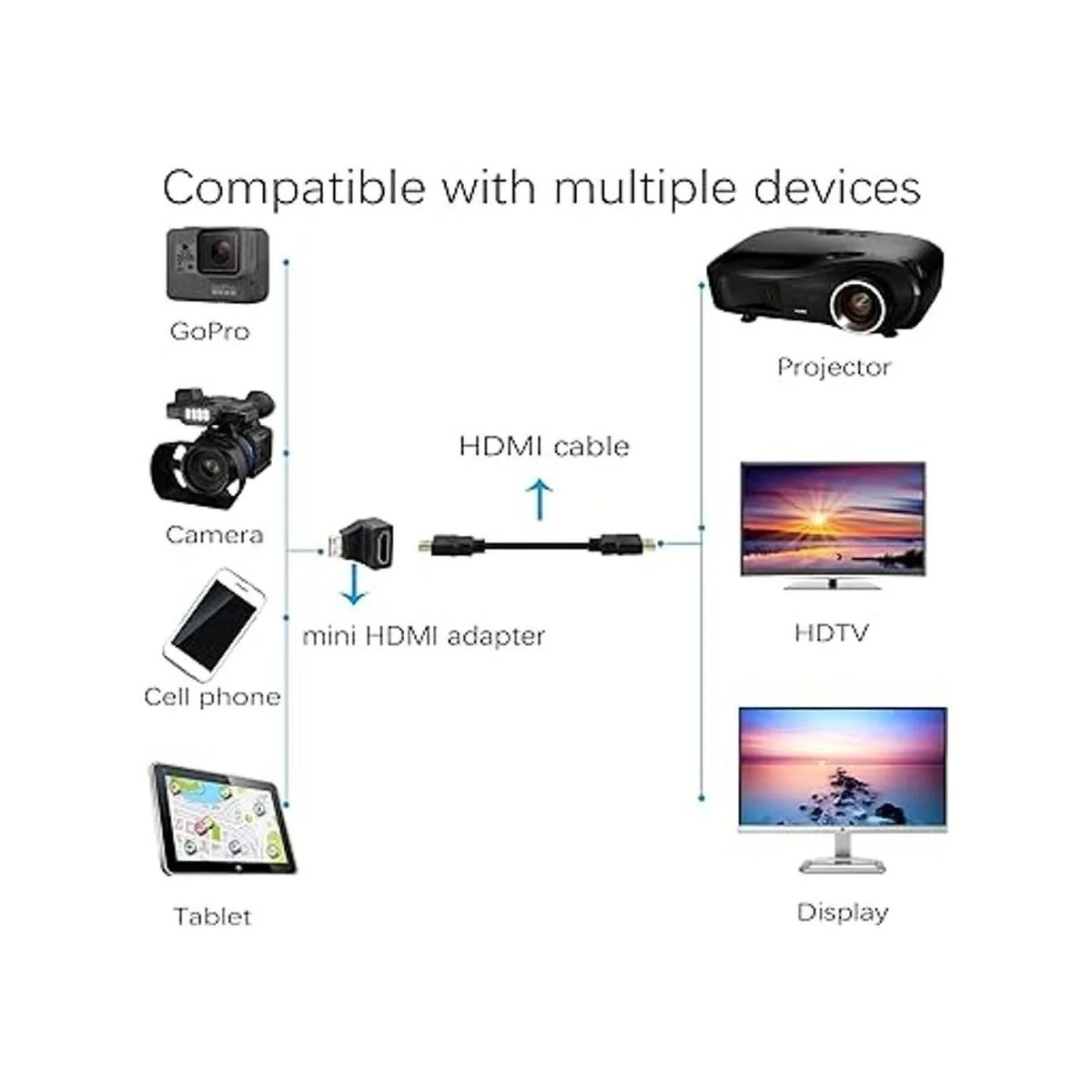 El adaptador mini HDMI a HDMI de ángulo recto te da la flexibilidad que necesitas, puede evitar doblar cables HDMI y reducir la tensión en los puertos HDMI. Puede proteger eficazmente el equipo dañado por múltiples enchufes y prolongar la vida útil del equipo y cables HDMI