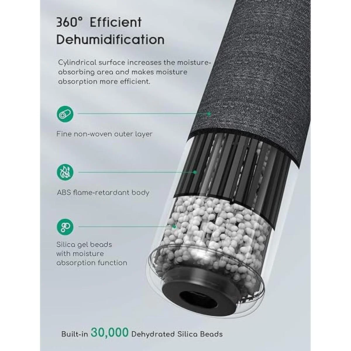 Circular de 360: el diseño del cilindro del deshumidificador inalámbrico aumenta el área de absorción de humedad y la entrada de aire circular de 360 hace que la absorción de humedad sea más eficiente.