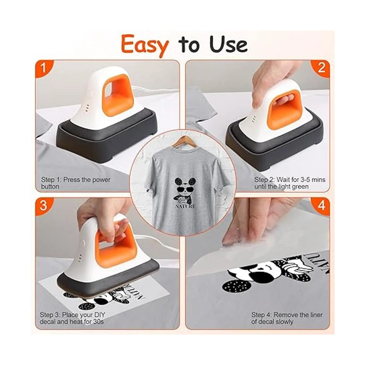 EASY USE COMPACT DESIGN Comes with Heat Press Mat for you to IronOn, all functions can be completed with one button, combined with this mini size. After set the suitable heating temperature, you only need to wait for 35 minutes, then you can start your DIY work when you hear the sound of DI.This portable easy press machine is easy to carry, lightweight and store.