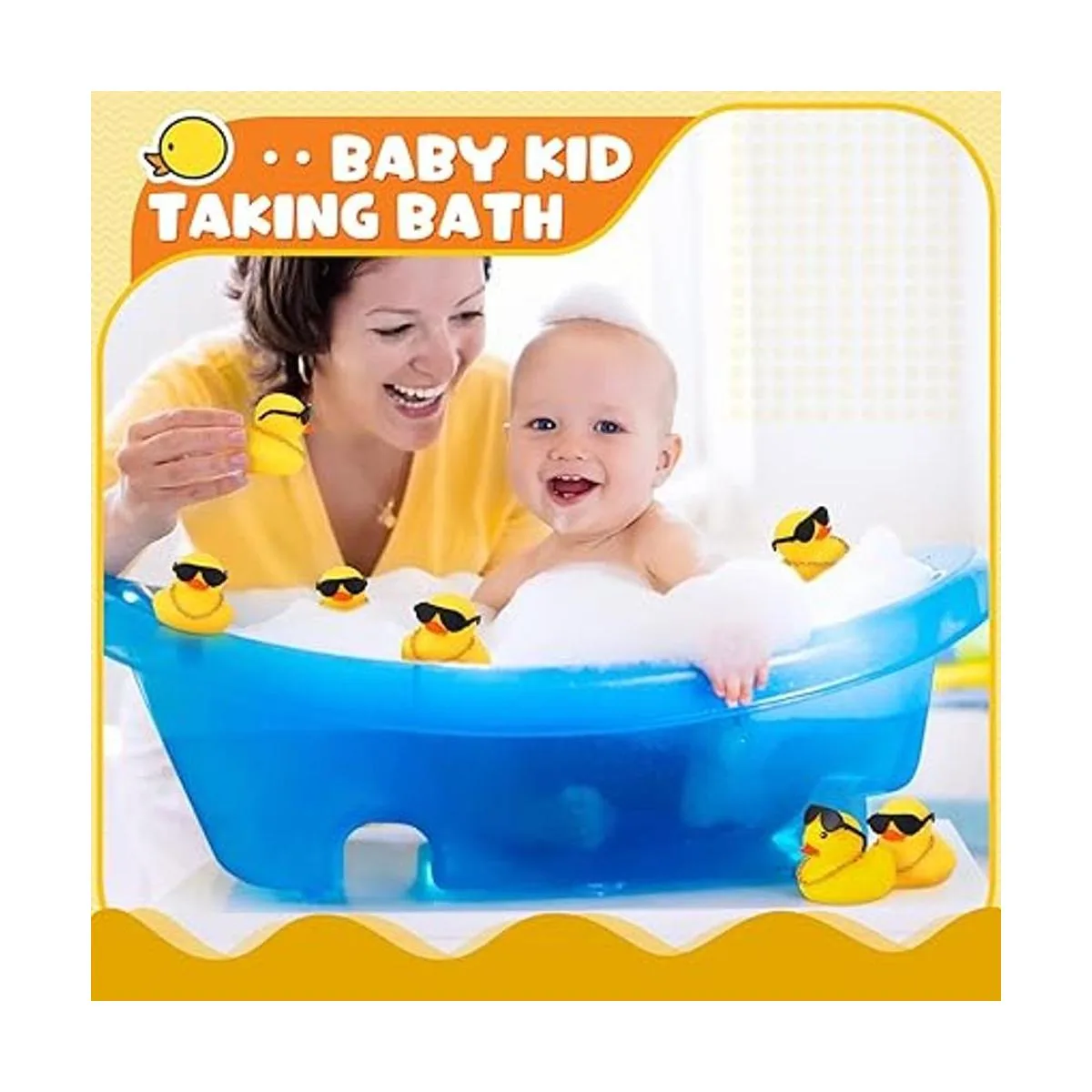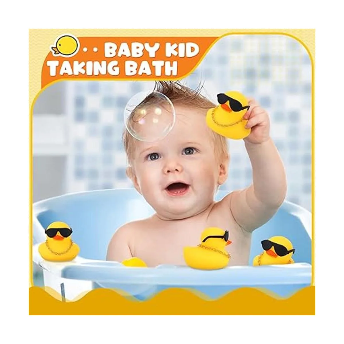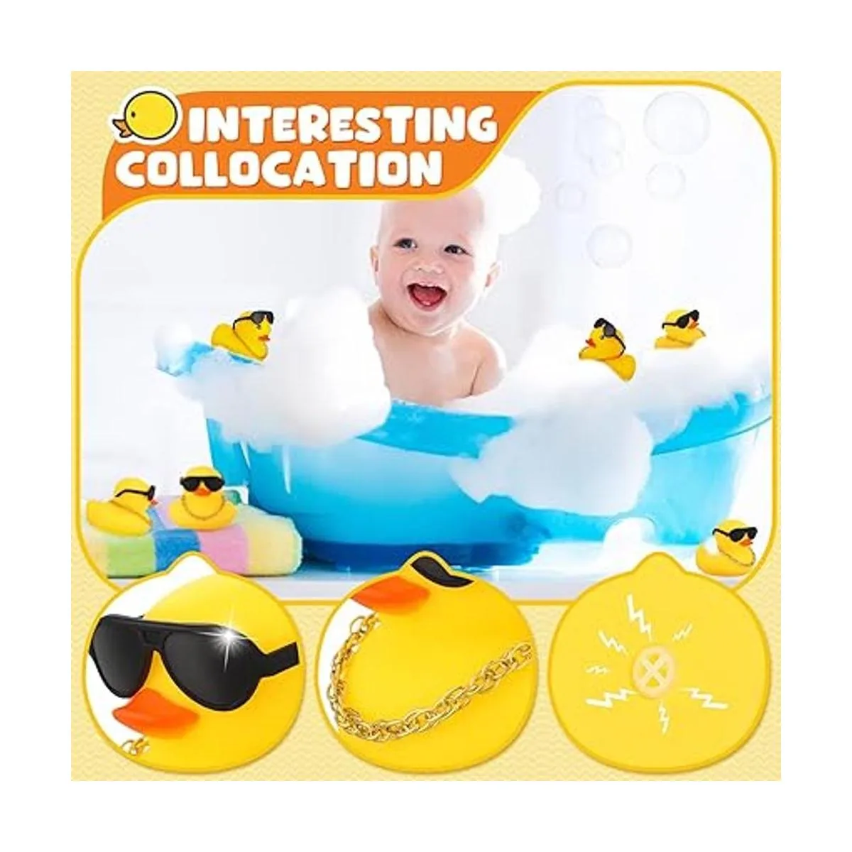 Baño feliz: con bonito y vibrante aspecto de pato amarillo y gafas de sol y collares a juego, los pequeños patos de goma son frescos, pueden flotar en el agua; cuando presionas, harán un sonido interesante, añaden diversión al baño, por lo que son ideales para el baño del bebé o el bebé jugar en bañeras y piscinas